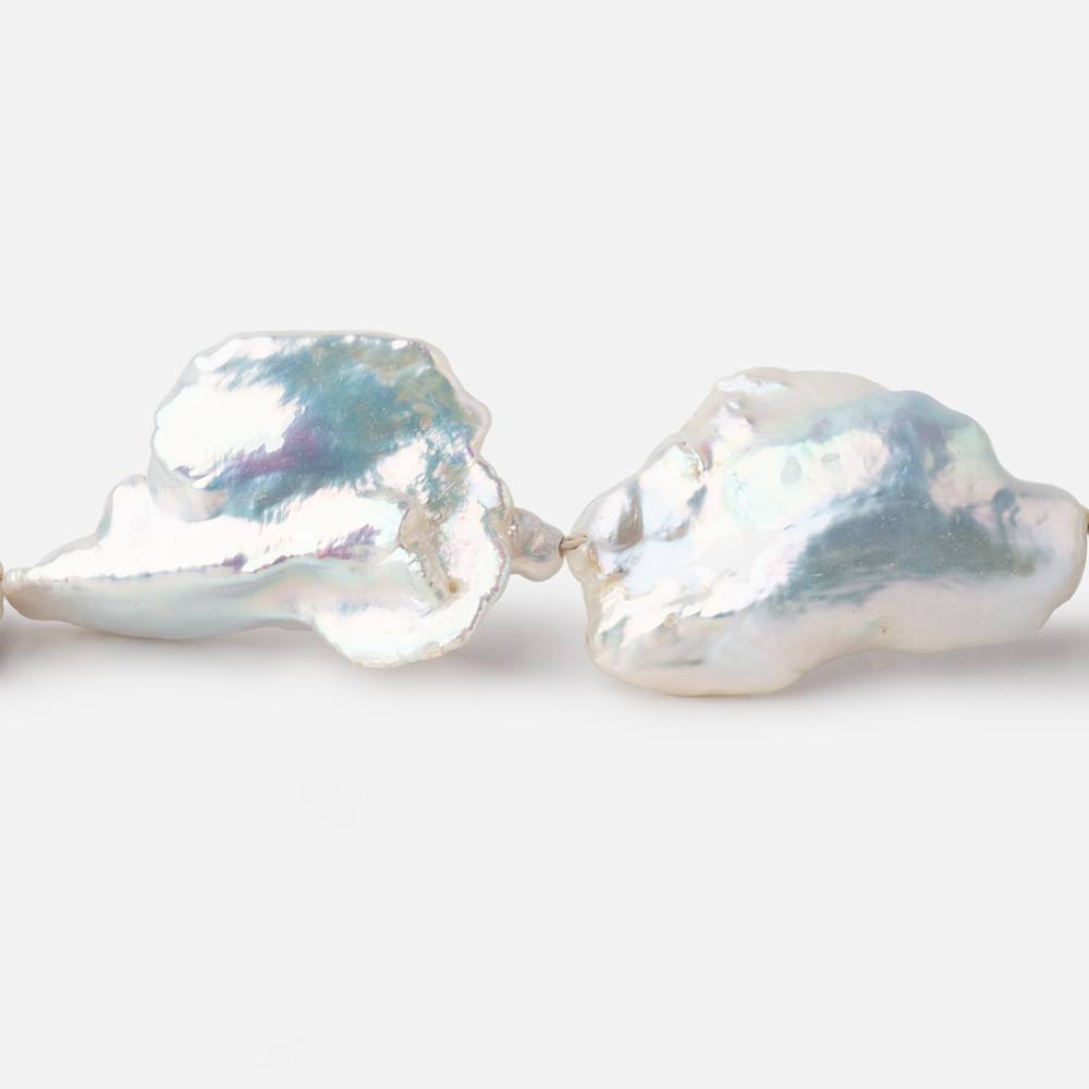 23x19mm up to 33x21mm Off White Soufflé Straight Drilled Baroque Freshwater Pearls are cultured with an organic substance in the center which is removed when the pearl is harvested. This process leaves the large outer shape of the pearl intact, thick, stable, with a thicker nacre than a normal pearl. Soufflé pearls have beautiful luster, show an iridescent orient, are well matched for color, show great irregular shapes on the strand, and have a near weightless heft allowing for a variety of jewelry options. These pearl strands are one of a kind and the photographed items will be the one shipped. A grade.