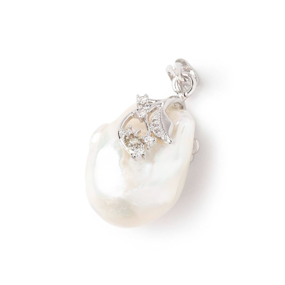 23.5x17x16.5mm White Ultra Baroque Pearl .925 Sterling Silver Pendant has a beautiful luster with an iridescent orient. This one of a kind pearl focal has an asymmetrical shape, has a nice heft and a soldered bail connected to the top ring that measures 8x4mm with a 3.5mm opening. This Ultra Baroque pendant is topped with a floral design in Sterling Silver and has colorless CZs creating a unique focal with an overall length of 33mm.