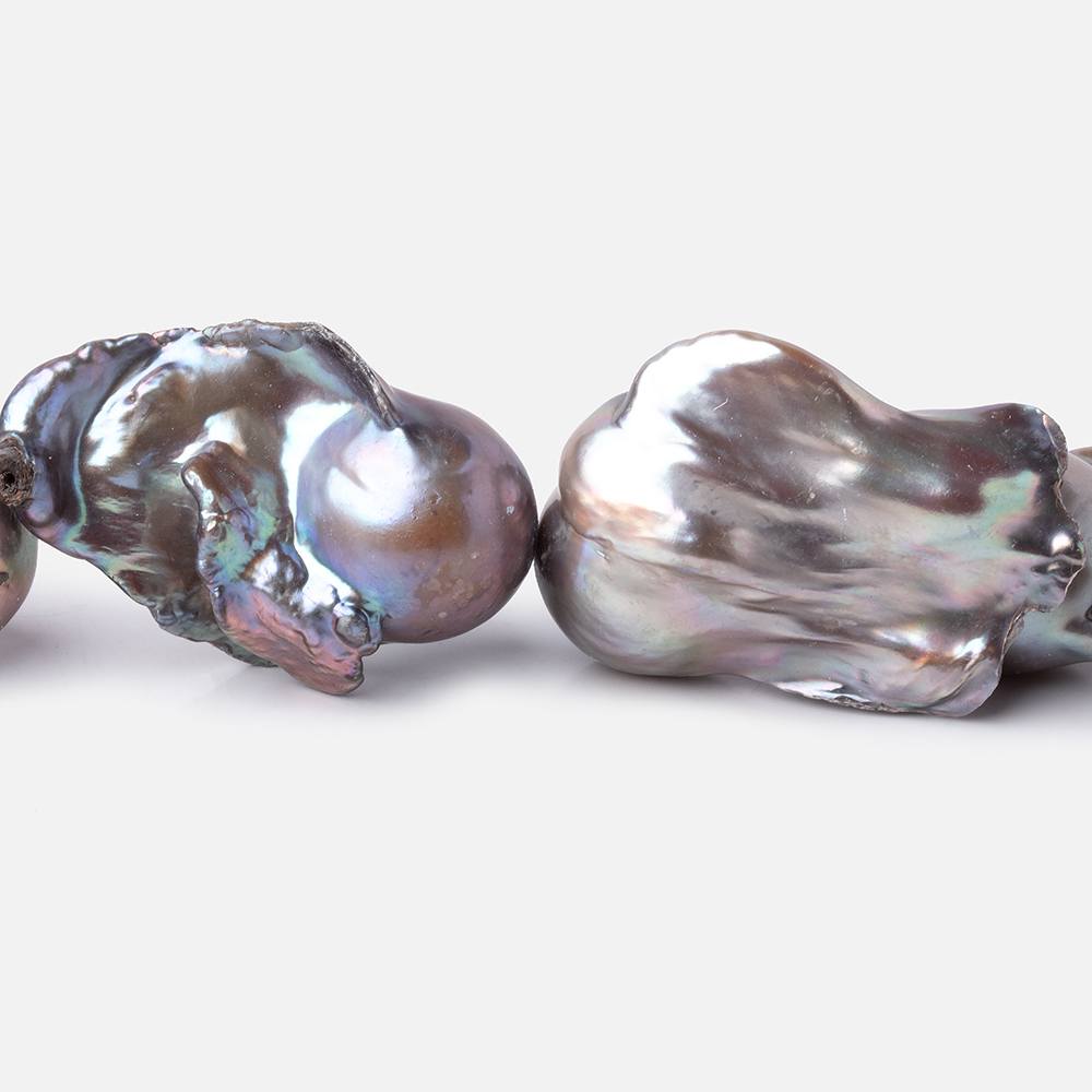 25x15mm to 35x16mm Warm Silver Ultra Baroque Freshwater Pearls show an irregular surface giving the pearl a unique appearance. These asymmetrical baroque pearls have nice nacre & high luster on a Silver Body with a slight peacock overtone. These straight drilled baroque pearls exhibit the best of baroque freshwater pearls with their size which is much larger than average and their luster which is near metallic. The drill holes measure approximately 0.8mm and the strand is well matched for orient, quality, color, and beauty providing for the AA Quality.