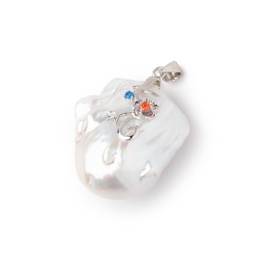 26x24x18mm White Ultra Baroque Pearl .925 Sterling Silver Pendant has a beautiful luster with an iridescent orient. This one of a kind pearl focal has an asymmetrical shape, has a nice heft and a soldered bail connected to the top ring that measures 6.5x3.5mm with a 3mm opening. This Ultra Baroque pendant is topped with a floral design in Sterling Silver and has a blue and orange CZ creating a unique focal with an overall length of 35mm.
