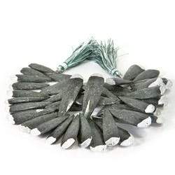 Cave Jasper Pear Briolettes measure approximately 28x10mm to 40x11mm in size, have a vitreous luster on the quartz portion of the gem and a dull luster on the ore portion of the gem, the bead shape is elongated to show the detail of the matrix and quartz feature, the gems look as if each were dipped in icing at the bottom, and the color is a slate grey mottled hue with a white milky quartz shoulder section for a truly unique piece. The top of one bead is broken above the drill hole; this bead will fit into a cap or will work for wire wrapping. The uniqueness and well made elongated pear shapes of the strand are what make this a great value.