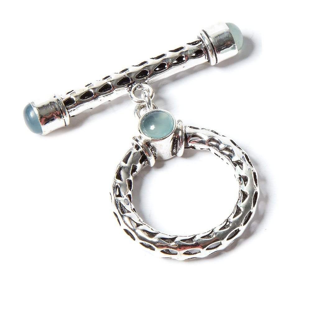 29x23mm Aquamarine Cabochon Filigree Antiqued Sterling Silver toggle has a pierced filigree design on the metal areas with gemstone cabochons on the toggle and on the bar ends. These well crafted toggles are hefty enough for your largest gemstone projects.