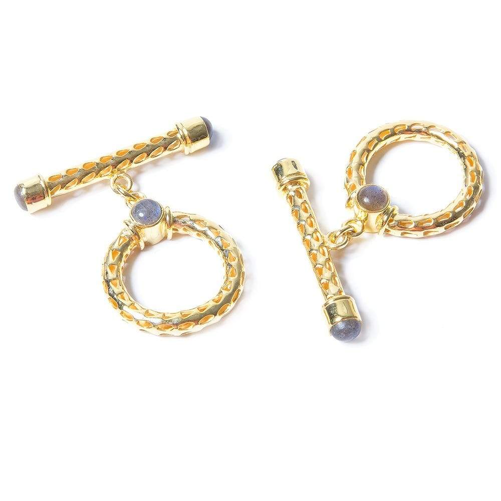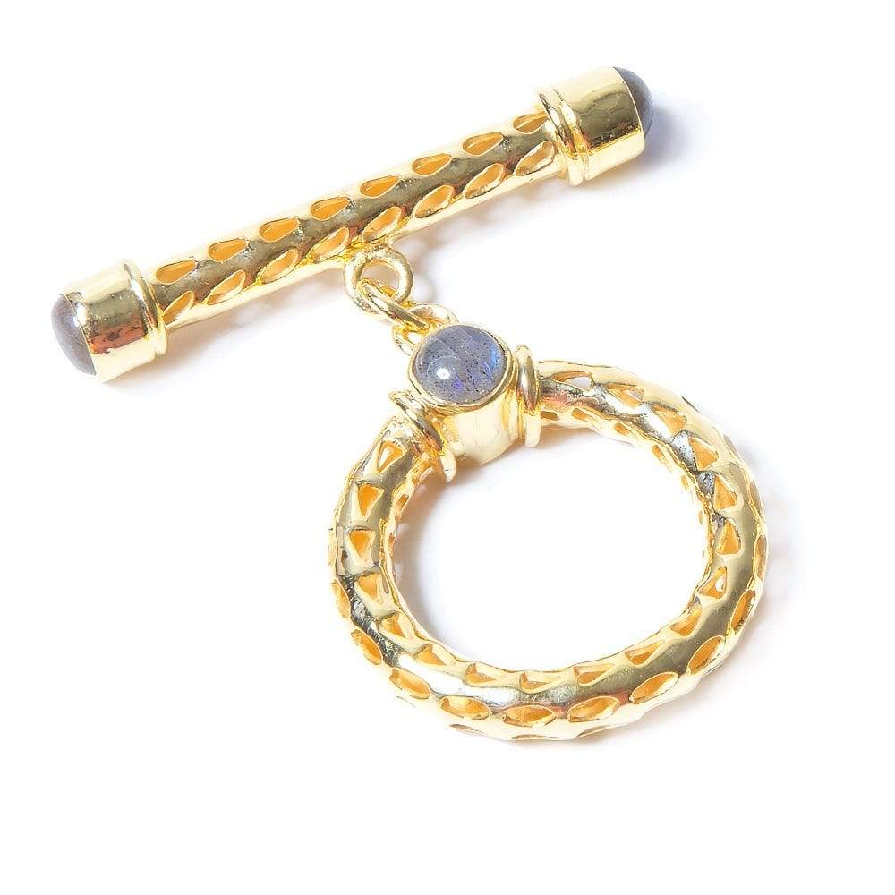 29x23mm Labradorite Cabochon Filigree Vermeil toggle has a pierced filigree design on the metal areas with gemstone cabochons on the toggle and on the bar ends. These well crafted toggles are hefty enough for your largest gemstone projects.