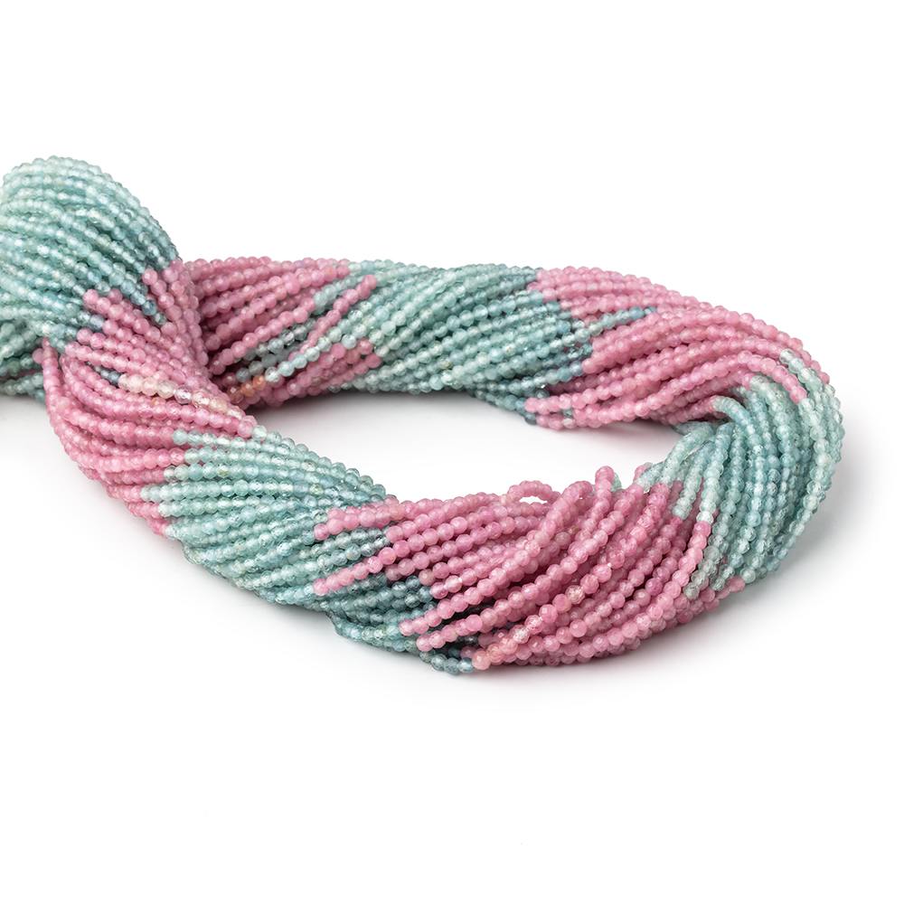 2mm Afghani Pink and blue Tourmaline micro faceted round beads have a variated pattern of pink tourmaline and indicolite Tourmaline and the gems are well matched in color and tone with great brilliance for a well crafted group of micro-fine faceted beads.