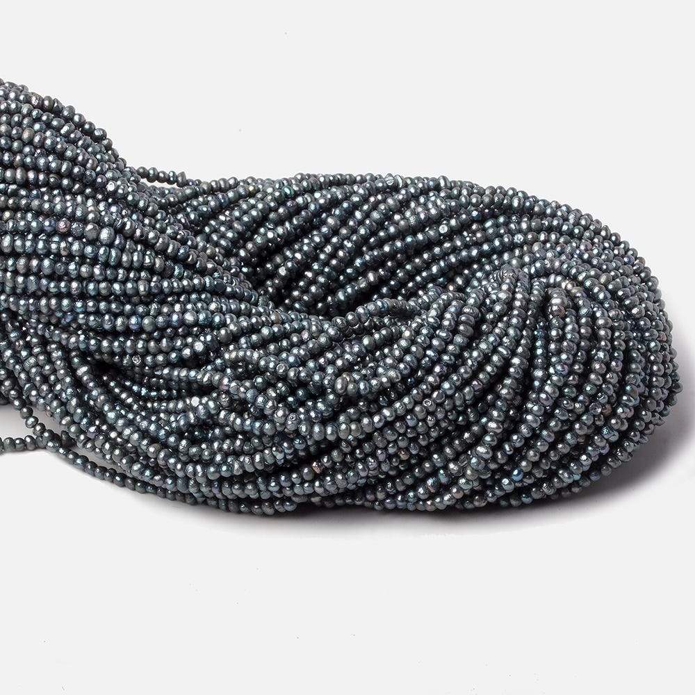 Blue Peacock Side Drilled Baroque Small Freshwater Pearl strand measures approximately 2mm average in size. These freshwater pearls have a great nacre quality exhibiting a slightly iridescent overtone showing excellent luster. These pearls are very well matched for color and quality on the strand. A Grade