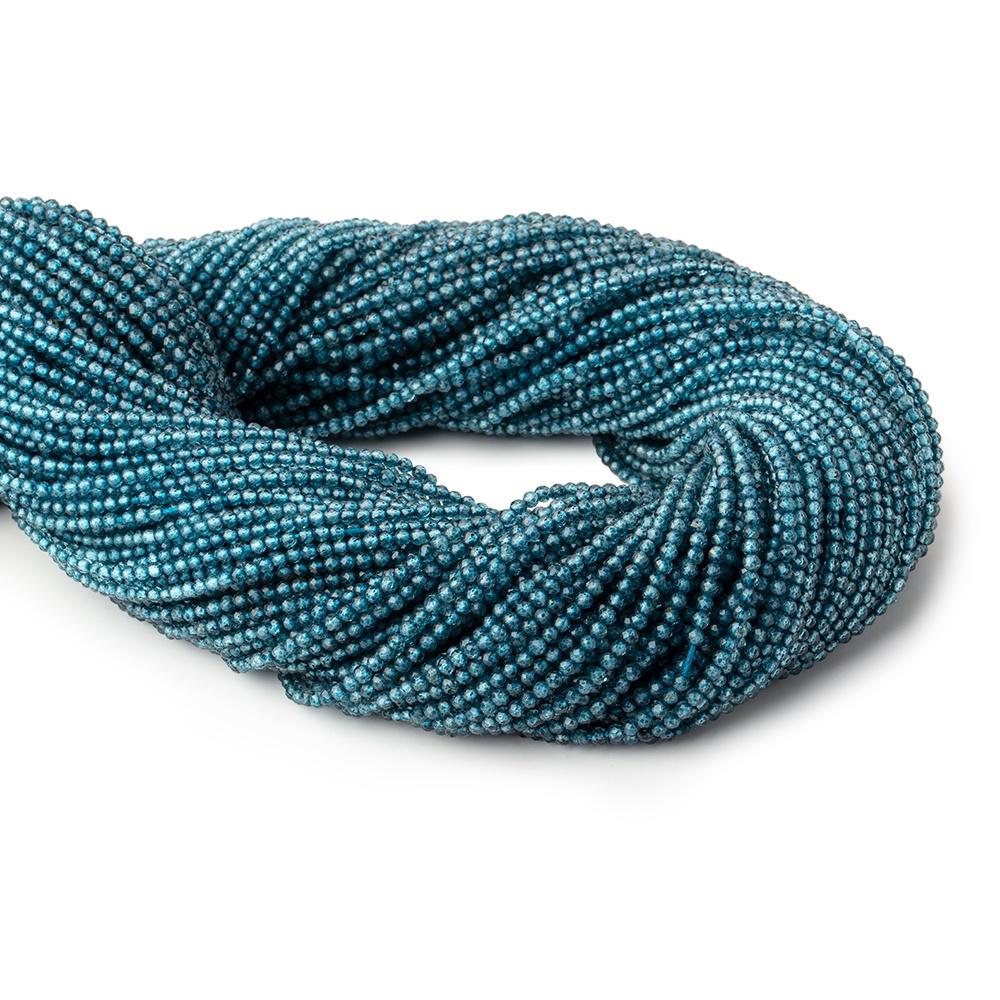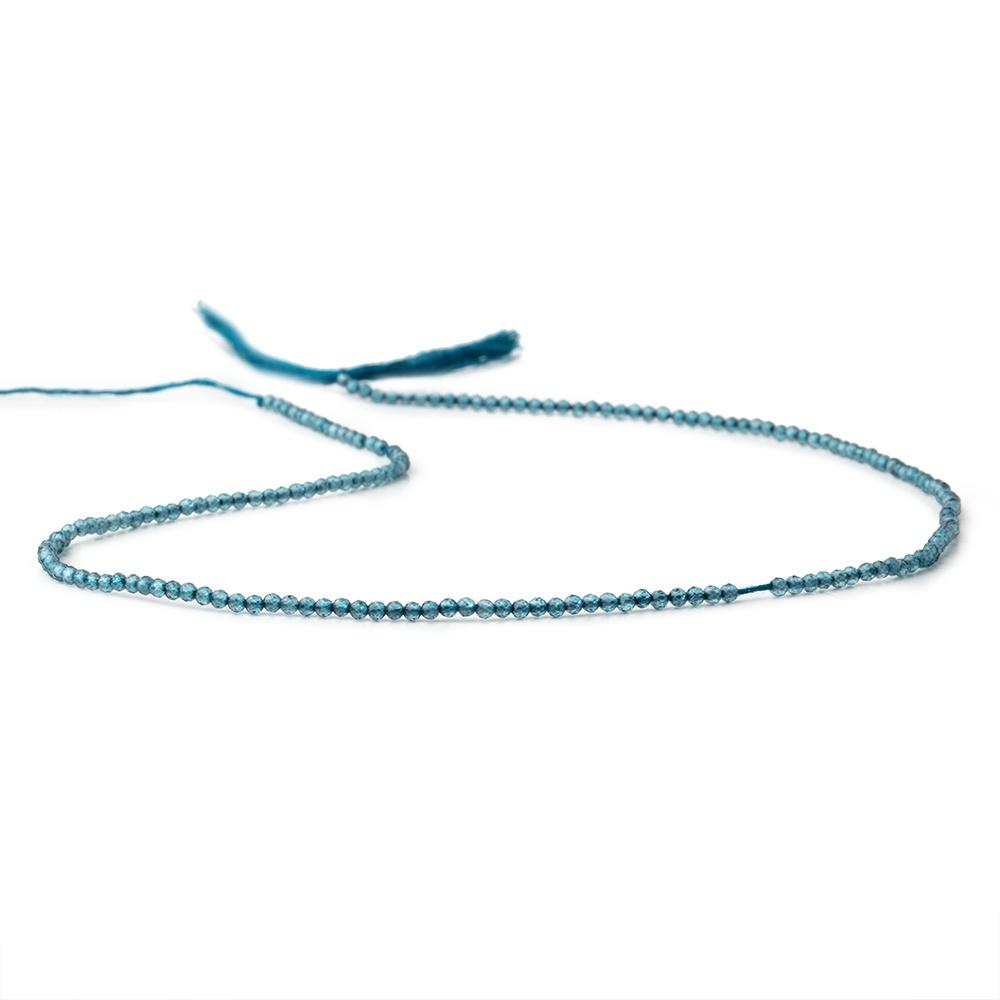 2mm London Blue Quartz Micro faceted round beads on 12.5 inch length having 180 pieces per strand for these expertly crafted beads showing excellent symmetry and brilliance with a perfect micro fine facet.