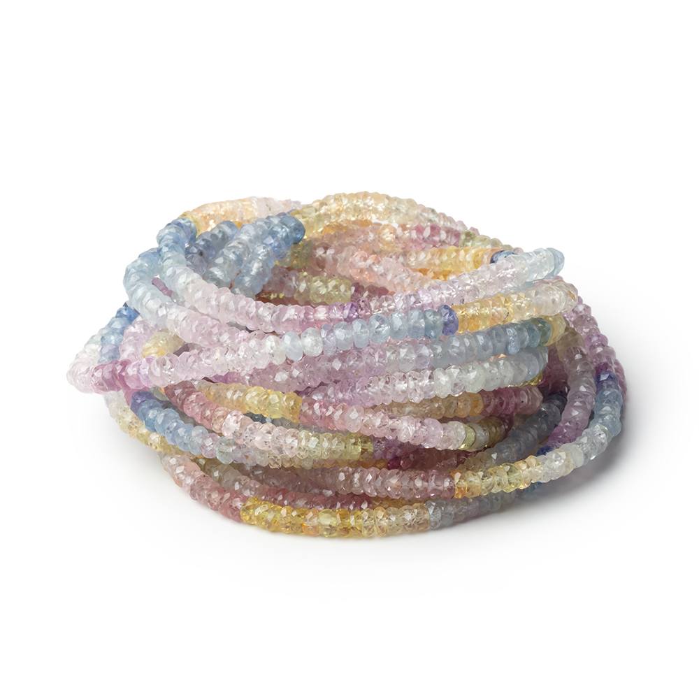 Multi Color Madagascar Sapphire Faceted Rondelles measure approximately 3.5mm to 4mm in diameter, exhibit a vitreous luster, excellent cut and polish, have beautifully symmetrical rondelle shapes, and are well matched for tone on strand. The translucent gem bodies have a variation of hues in yellow, pink, green, blue, violet and colorless hues with natural internal characteristics and this group of Sapphires from Madagascar are of an exceptional value for color and clarity which provides a AA quality grade.