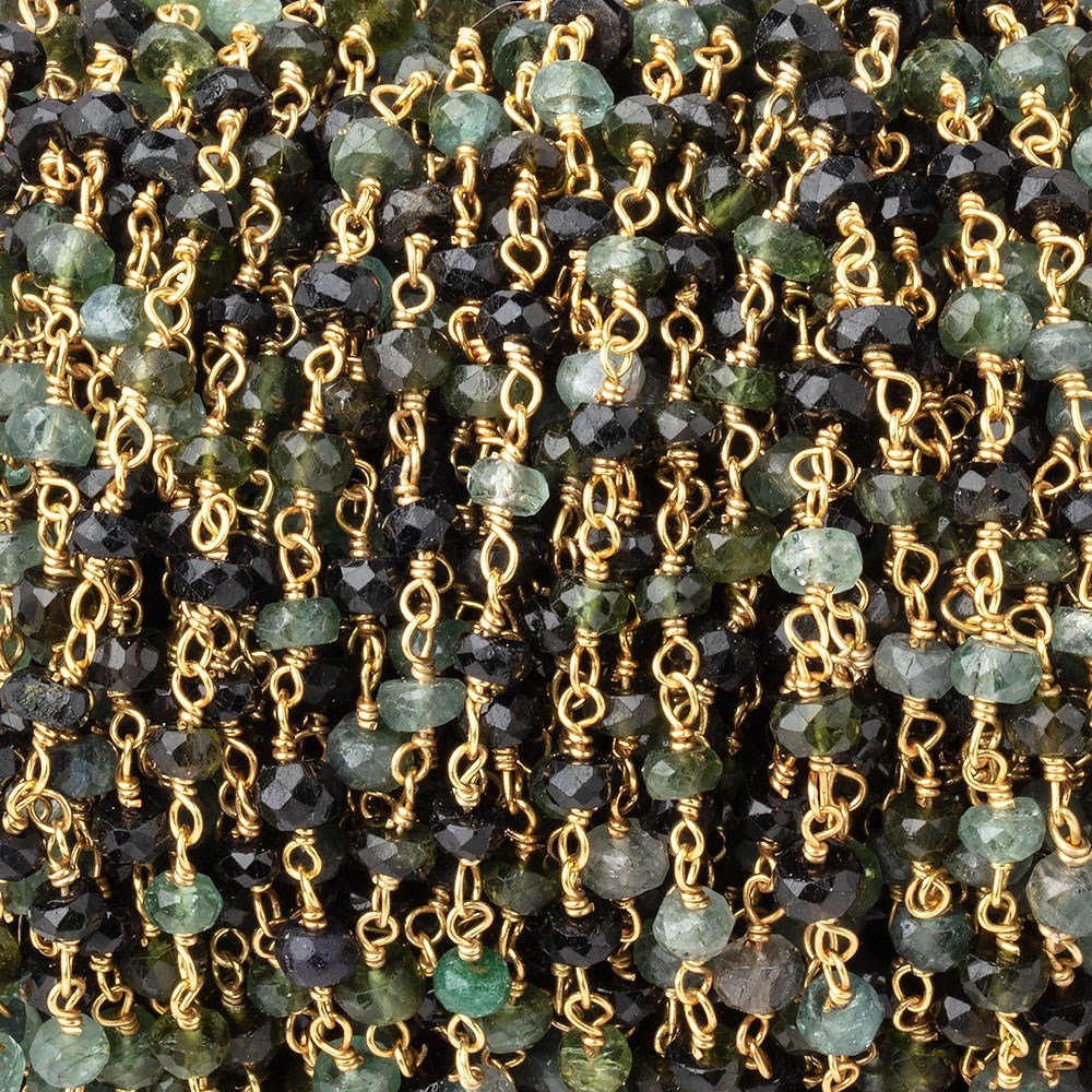 3.5mm average sized Black and Green Tourmaline Faceted Rondelle beads on Vermeil hand wrapped wire chain. Our line of Gemstone Chain by the foot has been painstakingly hand wrapped between each bead to create consistent measure. Our chains are sturdy enough to hold pendants or to use for layering within an ensemble. This Tourmaline Chain is sold in 12 inch increments with about 40 beads per foot.