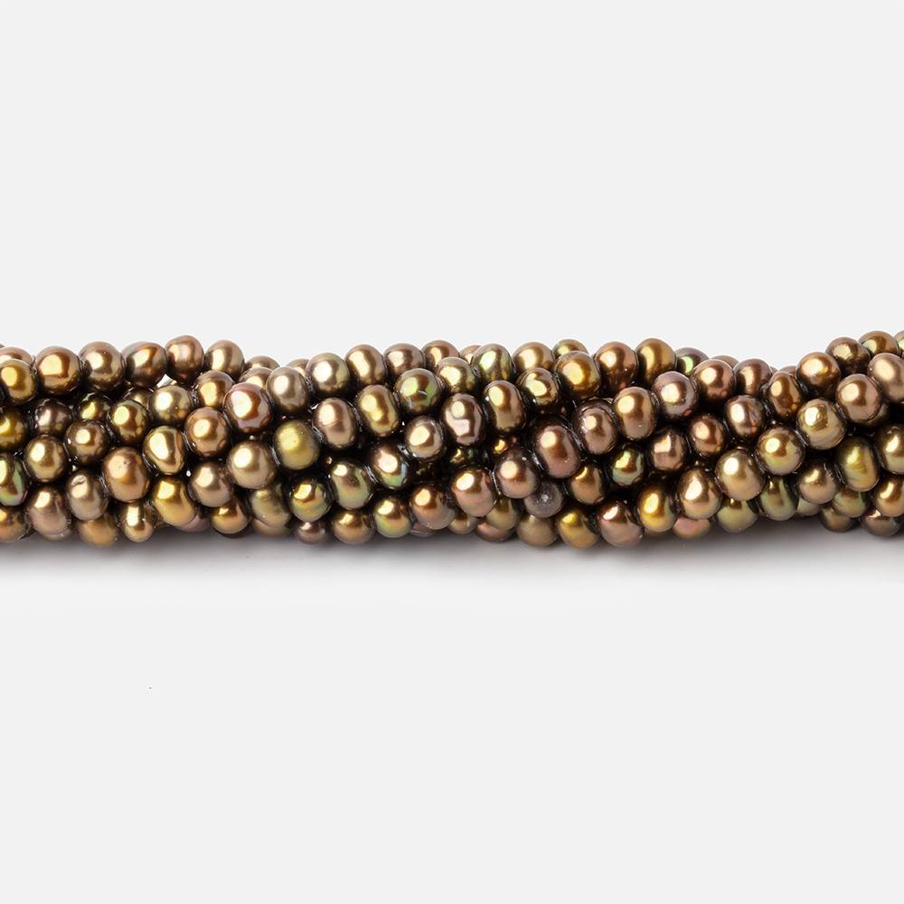 Light Olive Green Off Round Freshwater Pearls measure approximately 3.5x3mm on average, have an excellent high luster, excellent nacre quality, well matched on strand, have a uniform size with a symmetrical shape, color treated freshwater pearl, and the body is an olive green hue with a slight bronze overtone.