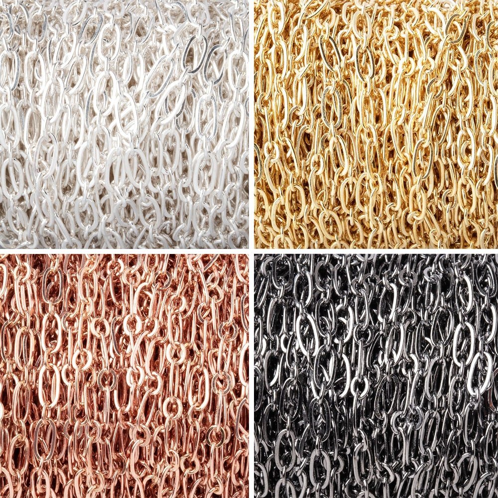 Plated Drawn Oval & Link Chain is sold in 3 foot increments. It has a shiny appearance, exhibits precision made metal links, and has a width measuring approximately 3mm. Available in Silver Plated, 22kt Gold Plated, Rose Gold Plated, and Black Gold Plated.