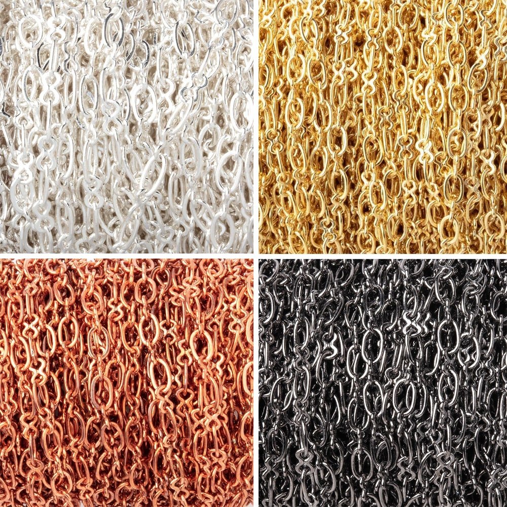 Plated Oval and Bowtie Link Chain sold as a pack of 3 feet, has a shiny appearance, exhibits precision made metal links, and has a width measuring approximately 3mm. Available in Silver Plated, 22kt Gold Plated, Rose Gold Plated, and Black Gold Plated.