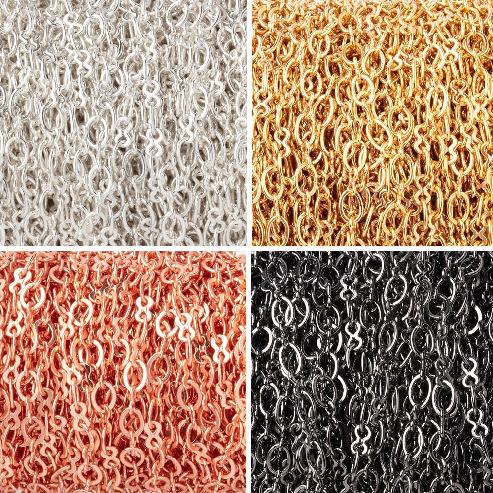 Plated Rounded Oval and Bowtie Link Chain sold as a pack of 3 feet, has a shiny appearance, exhibits precision made metal links, and has a width measuring approximately 3mm. Available in Silver Plated, 22kt Gold Plated, Rose Gold Plated, and Black Gold Plated.