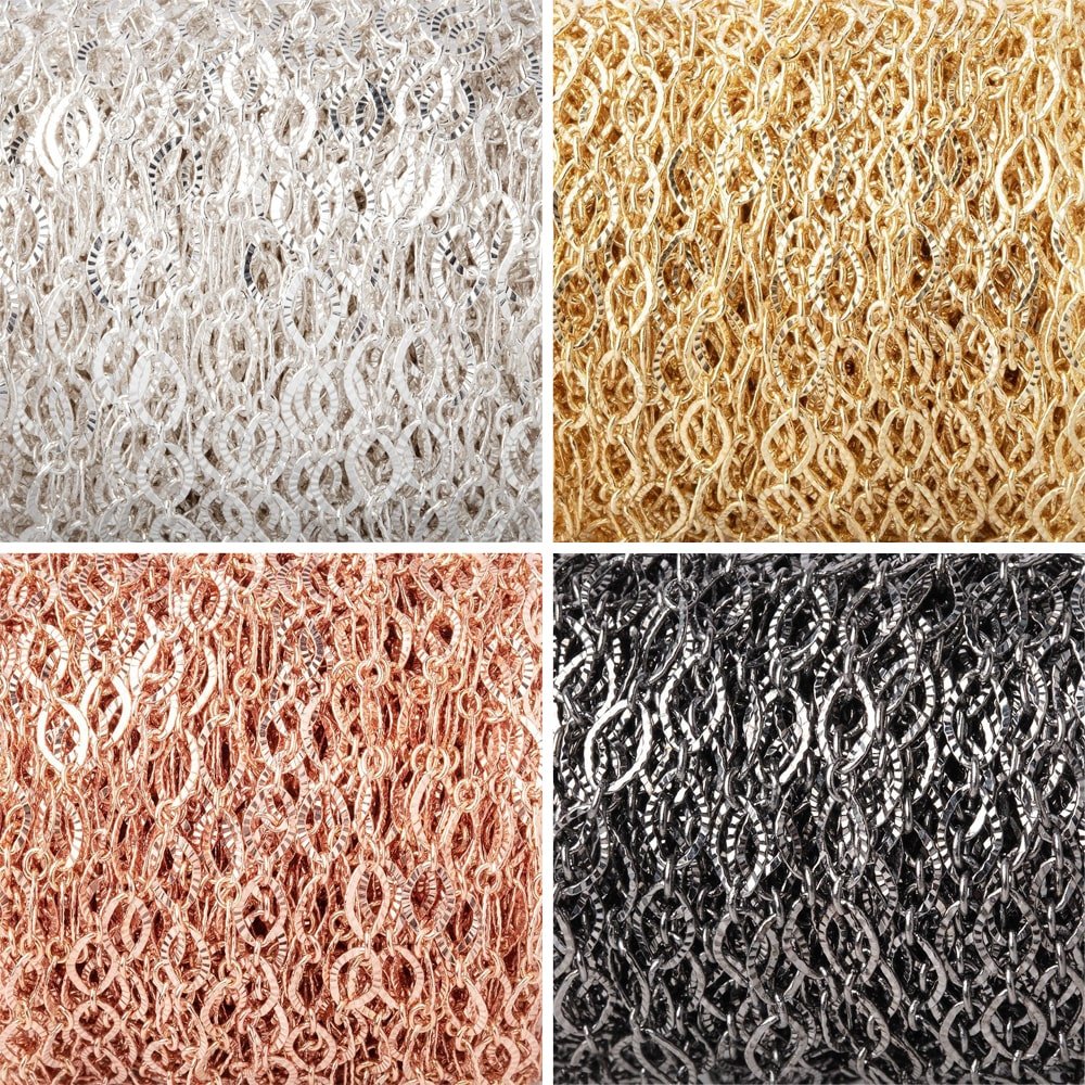 Plated Corrugated Oval Link Chain sold in 3 foot increments. This chain has a shiny appearance, exhibits precision made metal links, and has a diameter measuring approximately 5mm. Available in Silver Plated, 22kt Gold Plated, Rose Gold Plated, and Black Gold Plated.
