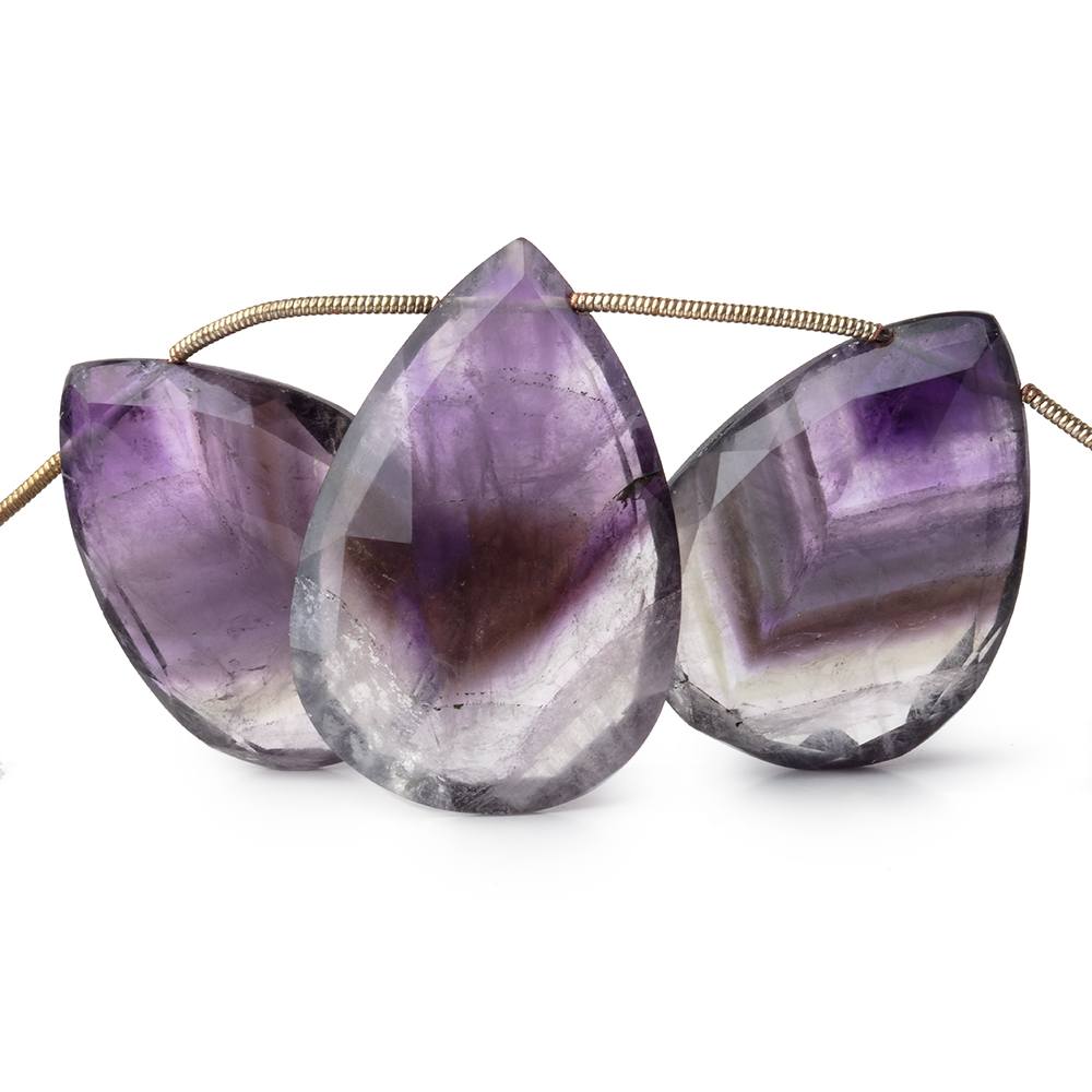 Houndstooth Cape Amethyst Faceted Pear Briolettes measure approximately 30x22x8mm to 34x23x8mm in size, have a vitreous luster, excellent polish and cut, the pear shapes are symmetrical, gems are very well matched on the strand, and the bodies are a translucent deeply saturated purple Amethyst and translucent colorless Crystal Quartz in a chevron shaped pattern, and this 8 Cape Amethyst bead strand is one of the most uniquely beautiful pieces in our inventory.