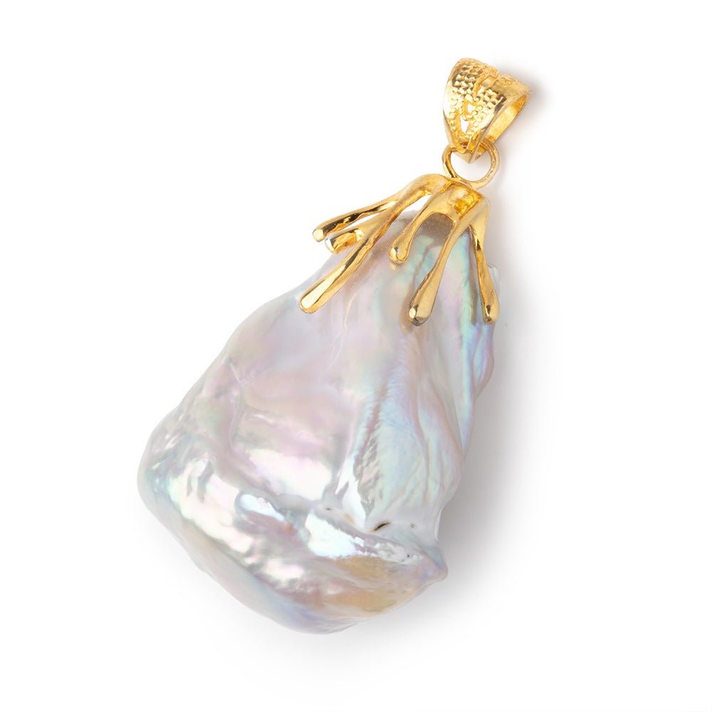 32x24x18mm Vermeil Silver hued Soufflé Pearl Pendant has a beautiful luster with an iridescent purple orient. This one of a kind pearl focal has an asymmetrical shape and has a near weightless heft with a soldered bail connected to the top ring that measures 7.5x5mm with a 3.5mm opening. This Soufflé pendant is topped with a dripping design in Vermeil creating a unique focal with an overall length of 43mm.