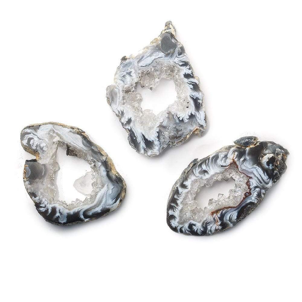 36x23mm average size Tri Color Occo Agate Drusy Slice exhibits a translucent to semi-translucent body with swirling tri-color patterns and an interior void with brilliant drusy crystal features with an unpolished exterior edge. There is no drill hole on the flat slice showing undyed and natural coloring.