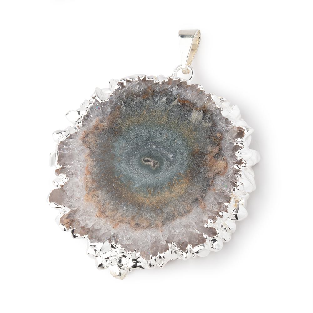 37x39mm Silver Leafed Amethyst Solar Quartz Slice Pendant with a Silver Leafed edge has a vitreous luster and is well polished. This one of a kind natural Stalactite Solar Quartz focal has an asymmetrical shape and is translucent to opaque in quality with a pinch bail connected to the top soldered ring. This Amethyst pendant has been sliced from the parent stalactite, and the Stalactite structures grew as a result of mineral rich water deposits within a limestone cave environment.