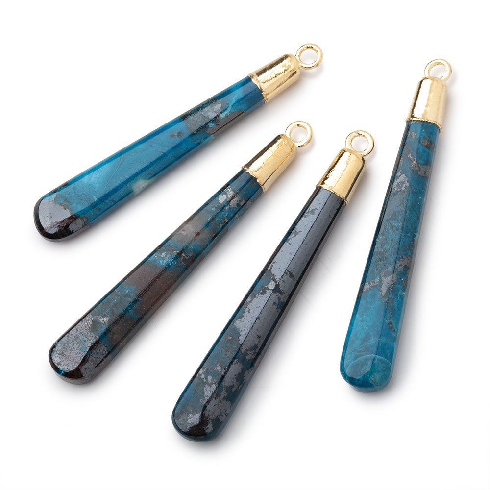 Gold Leafed Chrysocolla plain elongated pear pendants are sold as 1 focal bead measuring approximately 38x6mm to 41x6mm in size with a 3.5mm ring. Symmetrical, opaque beads with glass like luster and great make.