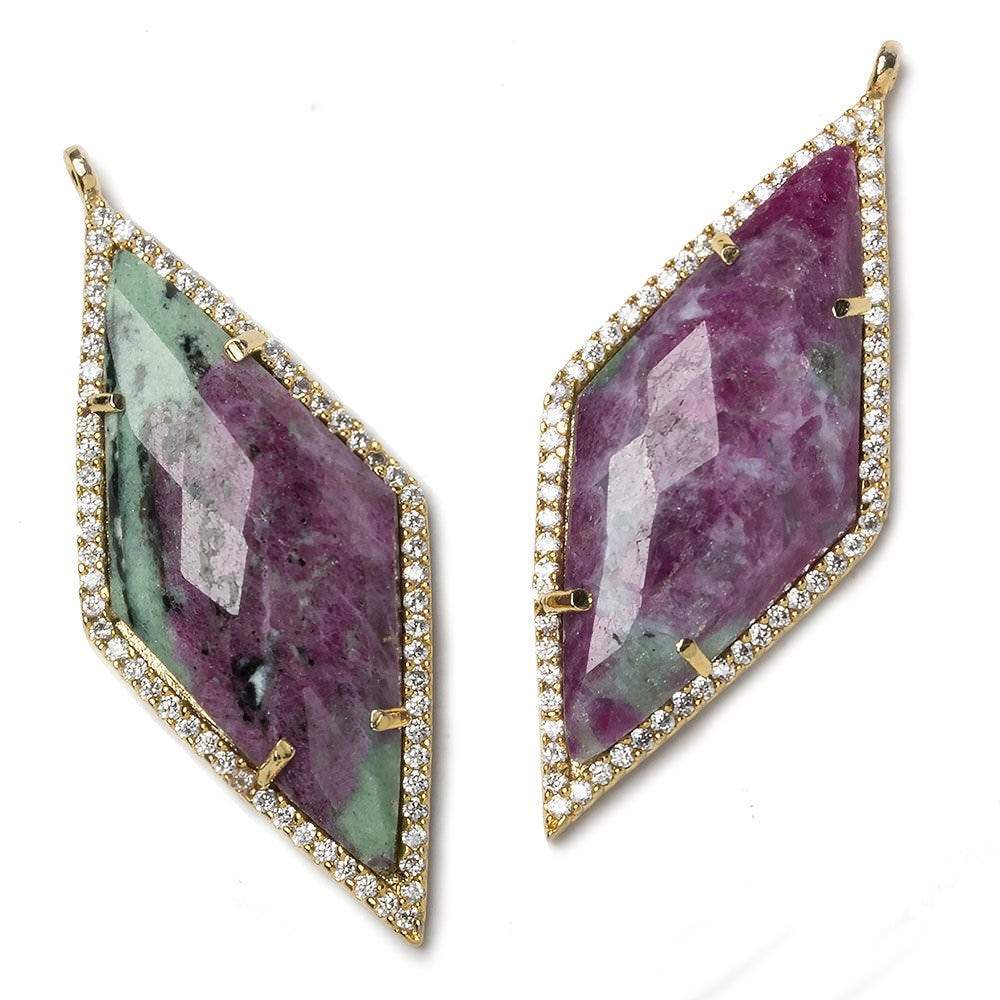 39x18mm Gold Bezel with pave' White Cubic Zirconia round brilliants surrounding a Ruby Zoisite faceted kite 1 ring Charm Pendant which is a well-made finished jewelry finding, crafted from high grade gemstone materials, and sold as one piece.