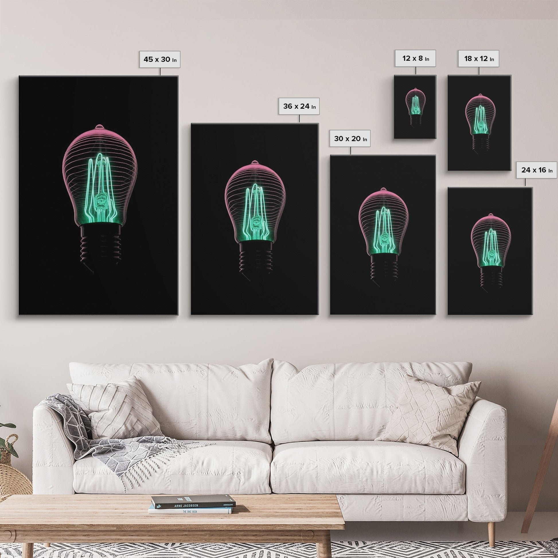 3D Light Bulb Wall Art, Neon Lights Art, Teal, Pink, Minimalist Print, Wall Decor, Canvas Print, Wall Art, Framed Canvas