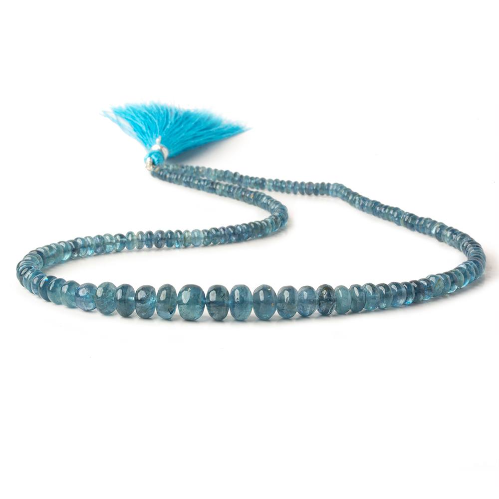 Santa Maria Aquamarine Plain Rondelles have a vitreous luster exhibiting brilliance and good polish on a symmetrical shaped transparent body having moderate internal characteristics. These blue variety Beryl beads are well matched for their deeply saturated, stable blue hue showing a fair consistency of quality or color throughout the strand. AA