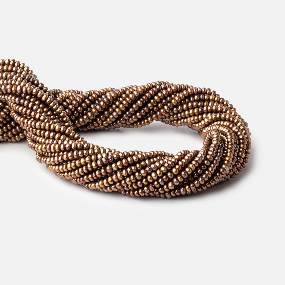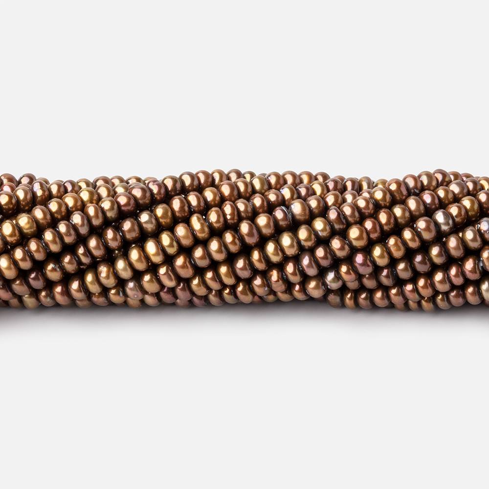 Brass Center Drilled Button Freshwater Pearls measure approximately 3x2mm on average, have a high luster, excellent nacre quality, well matched on strand, have a uniform size with a symmetrical shape, color treated freshwater pearl, and the body is a medium brass hue.