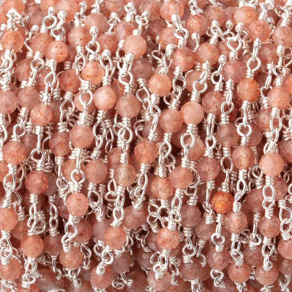 Sunstone micro faceted round beads on Silver plated Hand Wrapped Chain is sold by the foot and measures approximately 3mm with around 33 beads per 12 inch increment. Our line of custom manufactured chain is hand wrapped between each bead to create a consistent measure and are sturdy enough to hold pendants and can be used in an array of design styles.