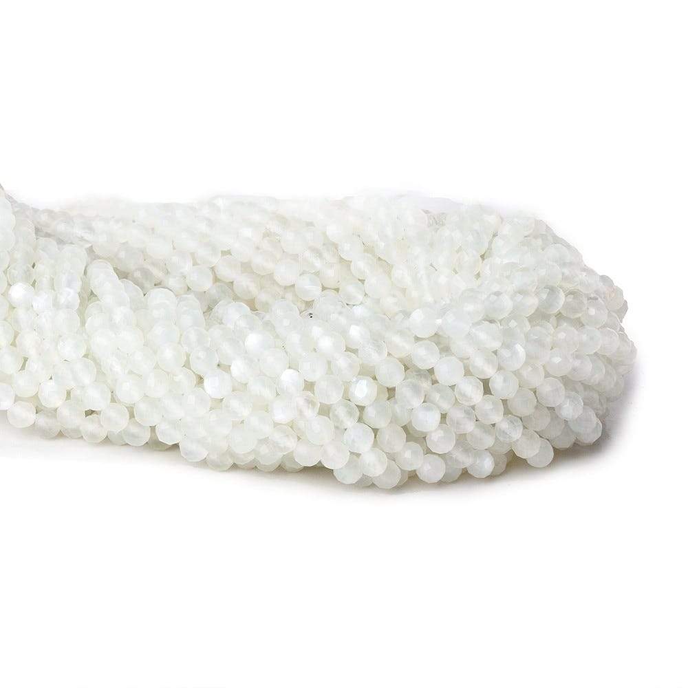 White Moonstone microfaceted beads showing a vitreous luster, a symmetrical shape, a well matched translucent quality, and a well crafted group of micro-fine faceted natural white hued Moonstone gemstone beads.