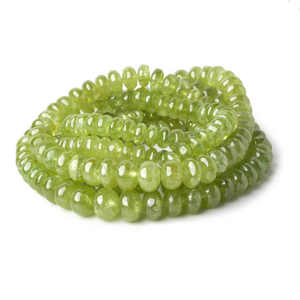 Green Grossular Garnet plain rondelles have a vitreous luster, superior polish, excellent symmetrical rondelle shapes, have a semi-transparent moderately included body of a medium yellowish green hue, and an even graduation in size from 4mm up to 7.5mm in diameter.
