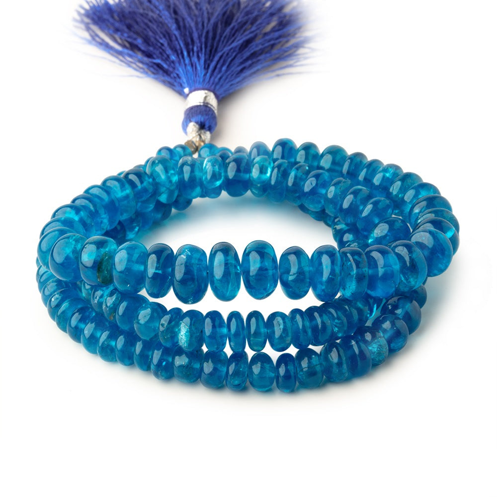 Neon Apatite plain rondelles measure approximately 4mm graduating up to 8.5mm in diameter, show a vitreous luster, good polish, symmetrical rondelle shapes, well matched for tone on strand, the transparent gem bodies are a dark neon greenish blue hue and there are slight internal characteristics visible in these exceptional beads.