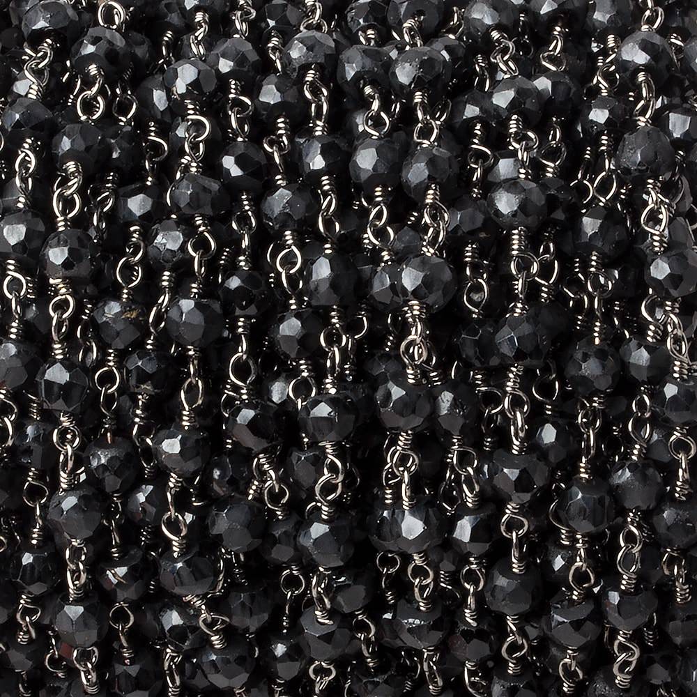4mm Black Tourmaline faceted rondelle Black Gold plated Rosary Style Chain sold by the foot having approximately 35 pieces.
