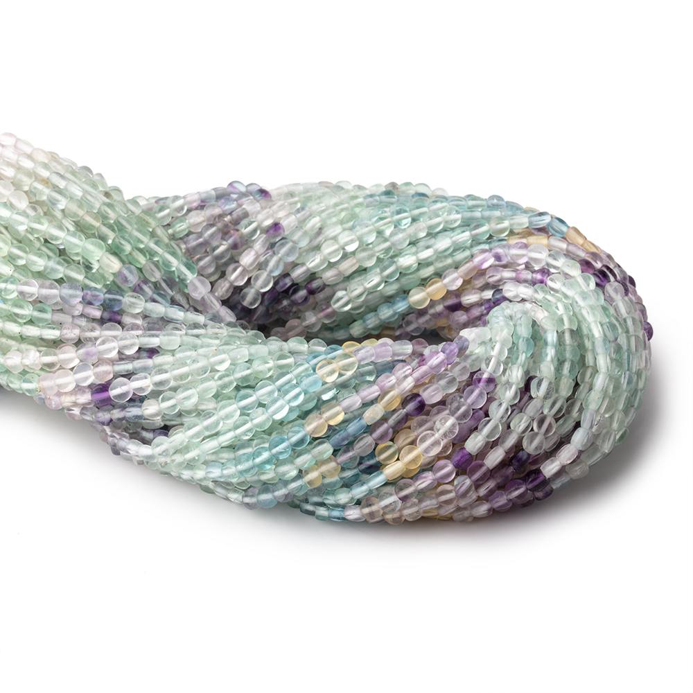 4mm Multi Color Fluorite checkerboard calibrated faceted coins have a vitreous luster, great polish, a calibrated shaped body, the gem bodies are brilliant quality, and the beads are well matched for quality on the strand. 0.8mm drill hole internal diameter