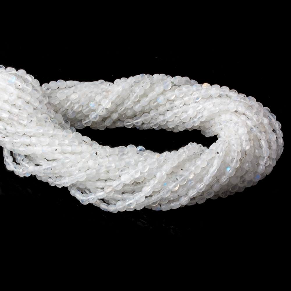 4mm Rainbow Moonstone checkerboard calibrated faceted coins have a vitreous luster, great polish, a calibrated shaped body, the gem bodies are brilliant quality, and the beads are well matched for quality on the strand creating a beautiful AAA grade bead group. 1mm drill hole internal diameter