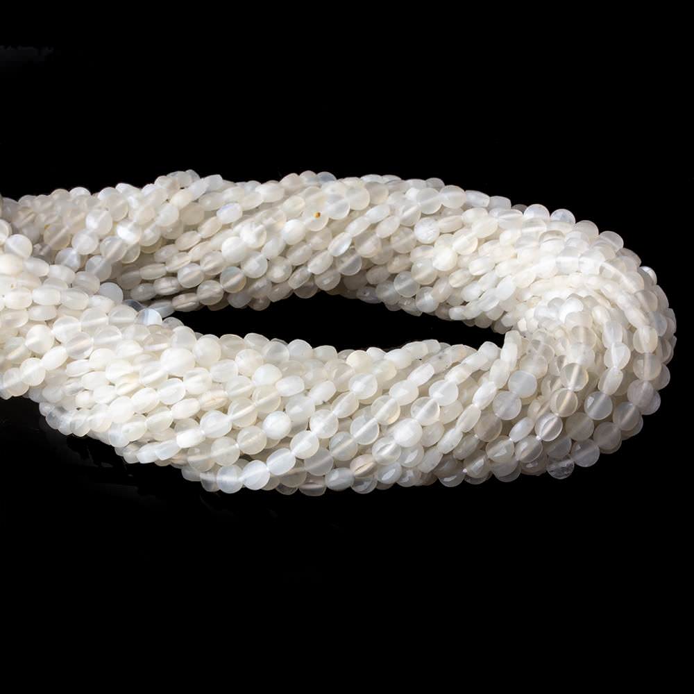 4mm White Moonstone checkerboard calibrated faceted coins have a vitreous luster, great polish, a calibrated shaped body, the gem bodies are translucent quality, and the beads are well matched for quality on the strand creating a beautiful AAA grade bead group. 1mm drill hole internal diameter