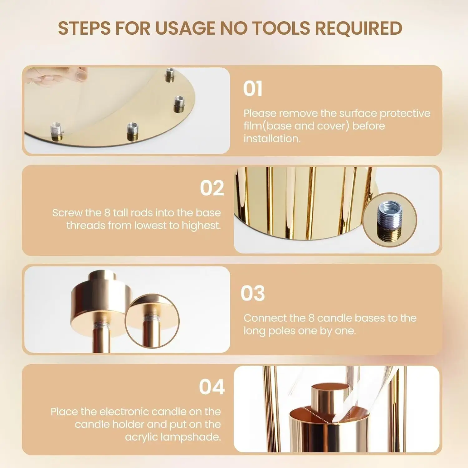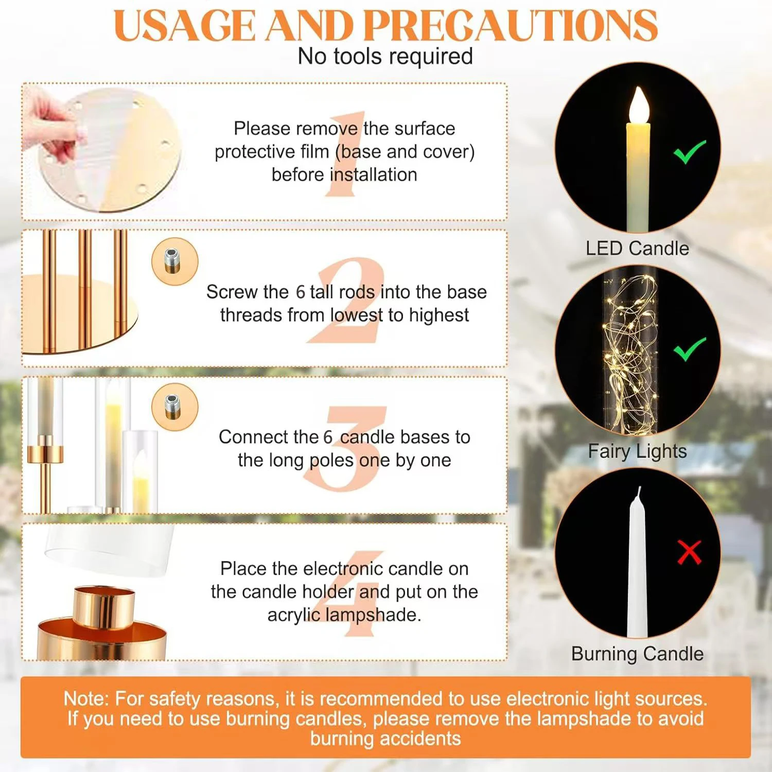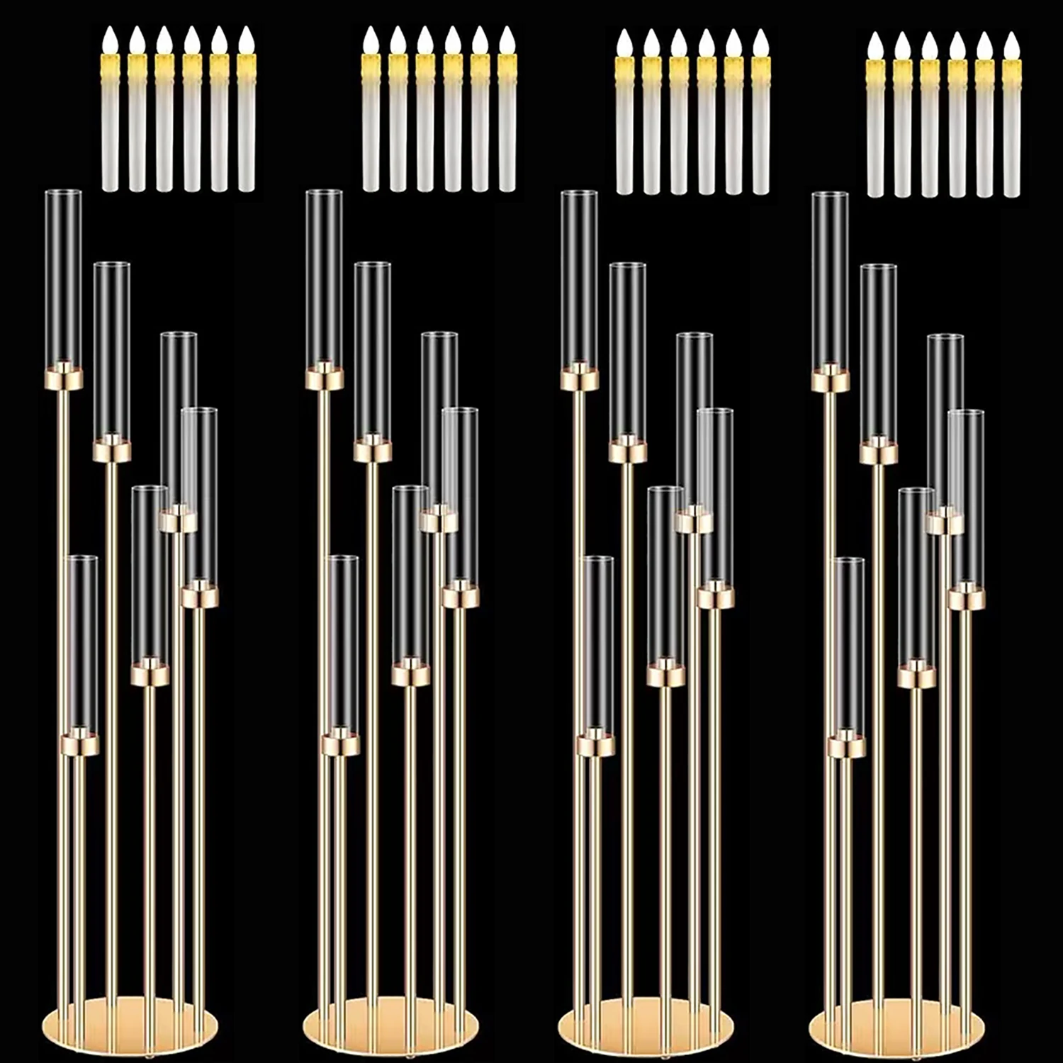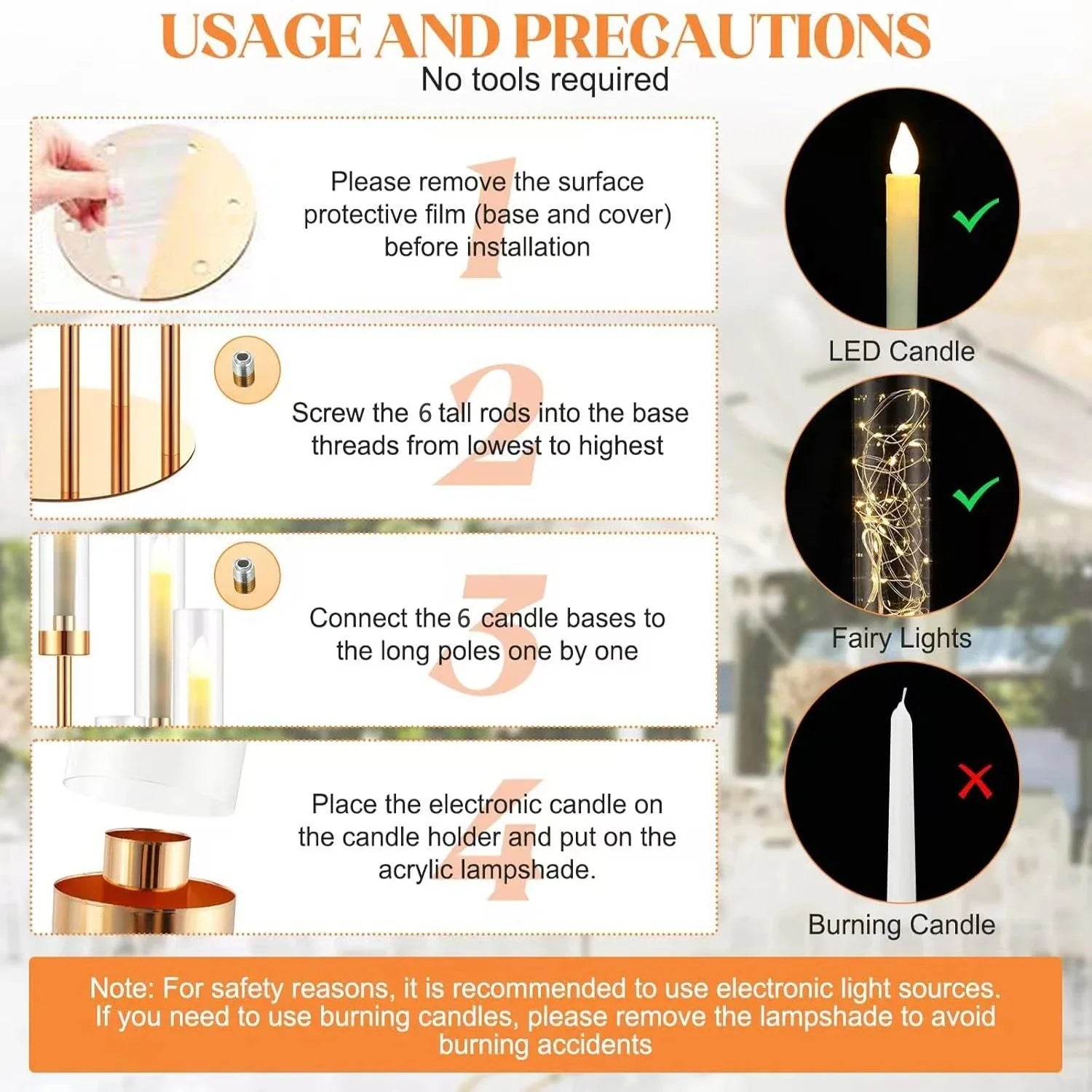 Golden Candle Holders Set: You Will Receive 4 Sets Of 5 Arm Golden Candelabras And 24 White LED Candles. The Height Of The 6 Arm Are Approximately 46.5inches, 42.5 Inches, 38.5 Inches, 34.5 Inches, 30.7 Inches,26.7 Inches.The Set Also Includes 6 Removable Acrylic Shades That Are About 9.8 Inches High And 0.87 Inches In Diameter, Great For Wedding And Party Decorations