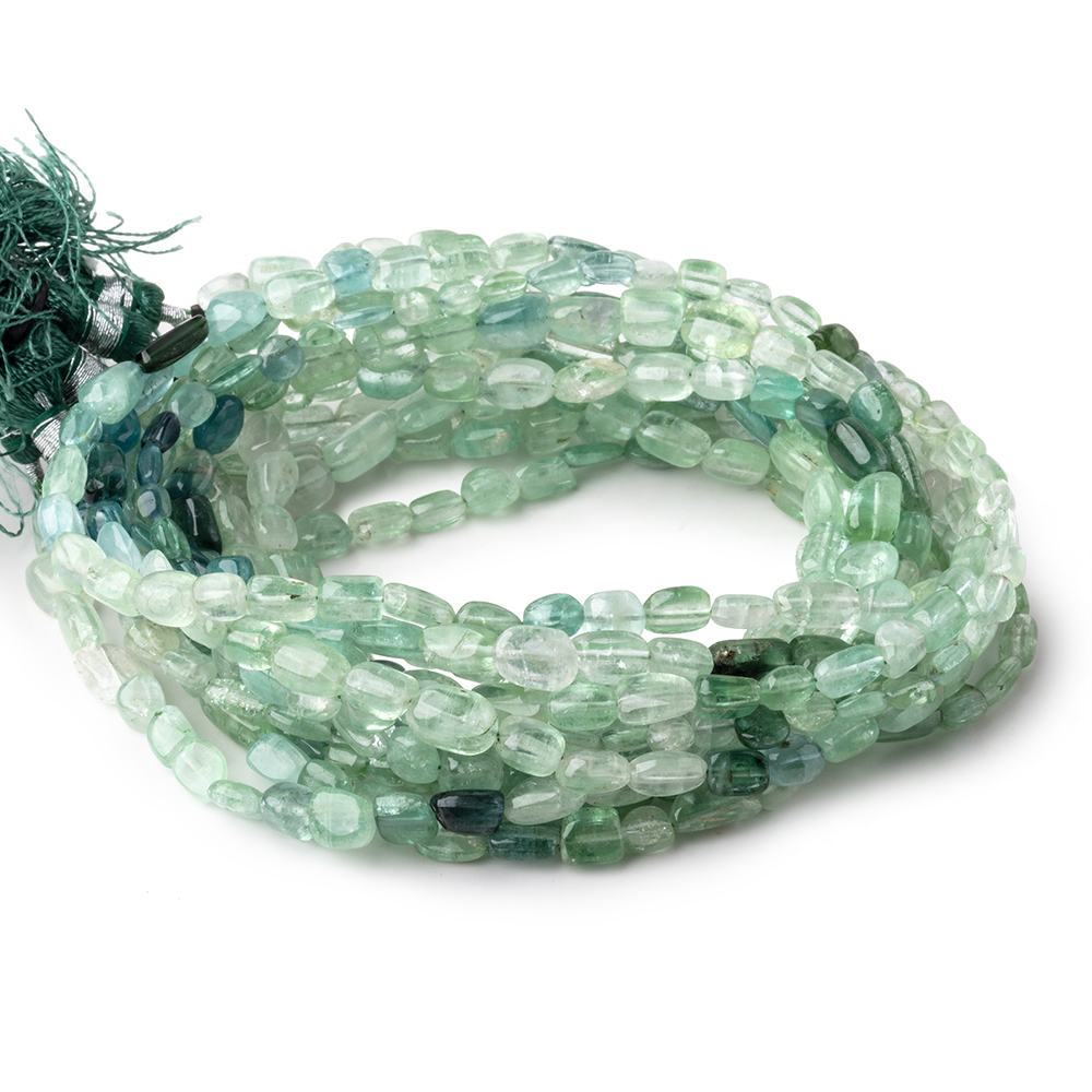 Shaded Green and Blue Afghani Tourmaline Plain Nuggets measure approximately 4x3mm to 7x4mm in size, have a glass like luster, nuggets are straight drilled light to medium green and blue hues, and the transparent gem bodies show internal characteristics and have good brilliance for an exceptional strand of tourmaline crystals with asymmetrical nugget shapes showing good polish.