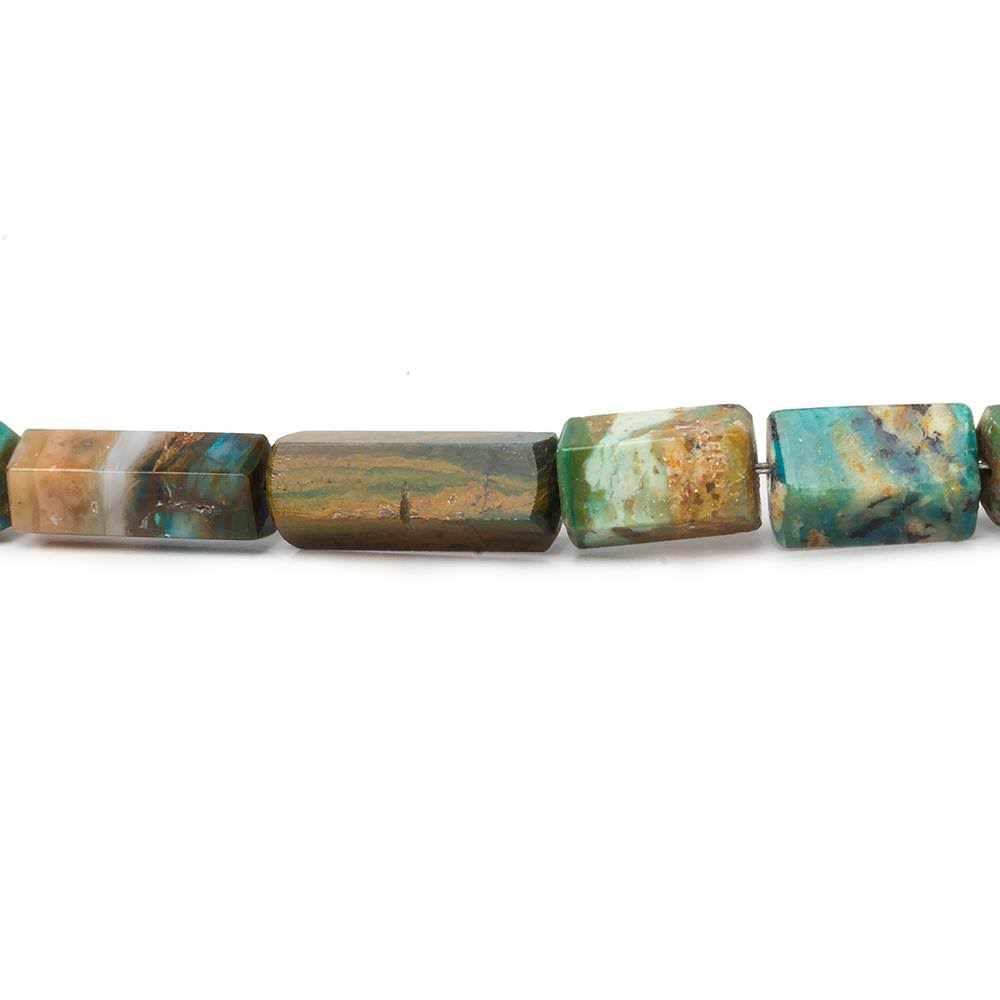 Blue Peruvian Opal plain hexagonal beads have a waxy luster with failry smooth polish shwoing on this varied group of wonderfully hued Peruvian Opals in shades of Blue, Turquoise, Green, Black and Sand. All strands will vary slightly for color composition. Lovely!