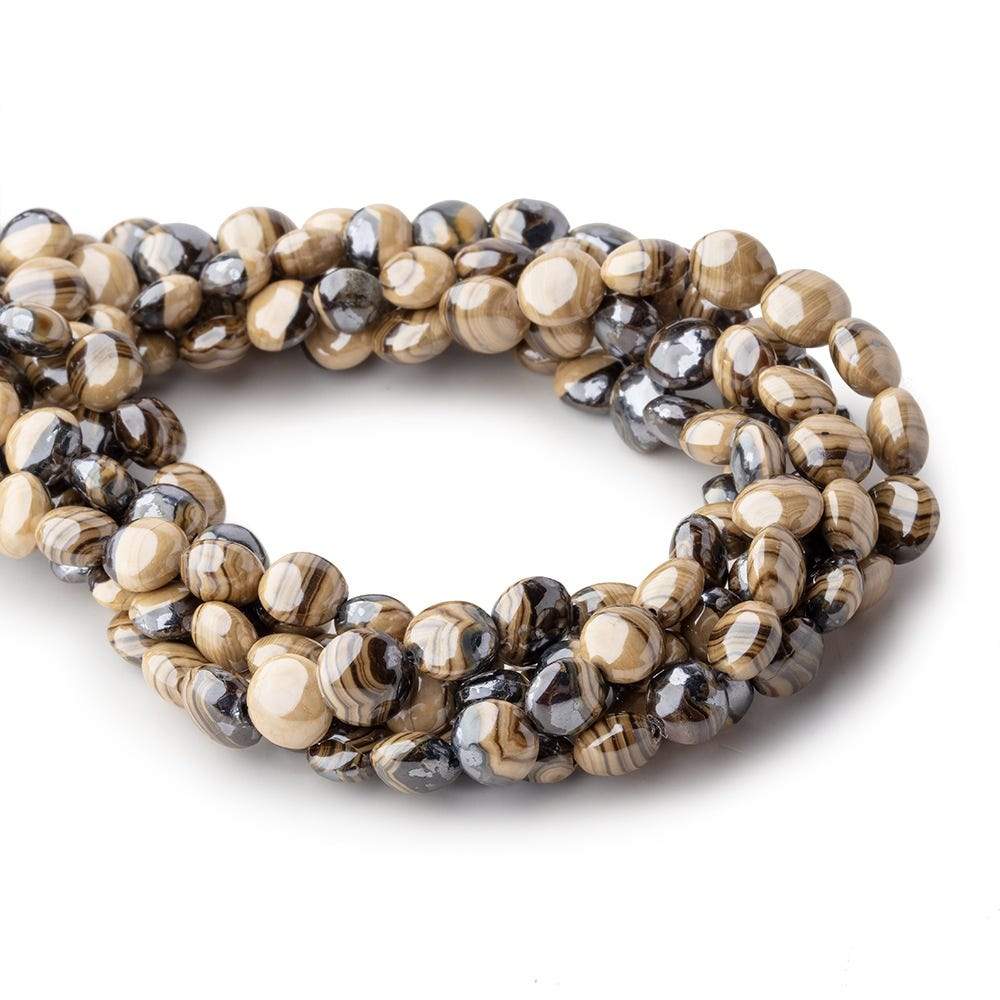 Schalenblende plain coin beads present as an opaque banded formation polished to reveal concentric Sphalerite and Wurtzite with metallic areas of Galena. Schalenblende consists of alternating bands of brown-yellow Sphalerite, Brunckite, and Wurtzite, and lustrous Galena of which Sphalerite and Wurtzite are fluorescent in UV light. These beads are symmetrical and have bountiful areas of metallic grey and banded golden yellow and brown hues. AA Rare gemstone mined in Poland.