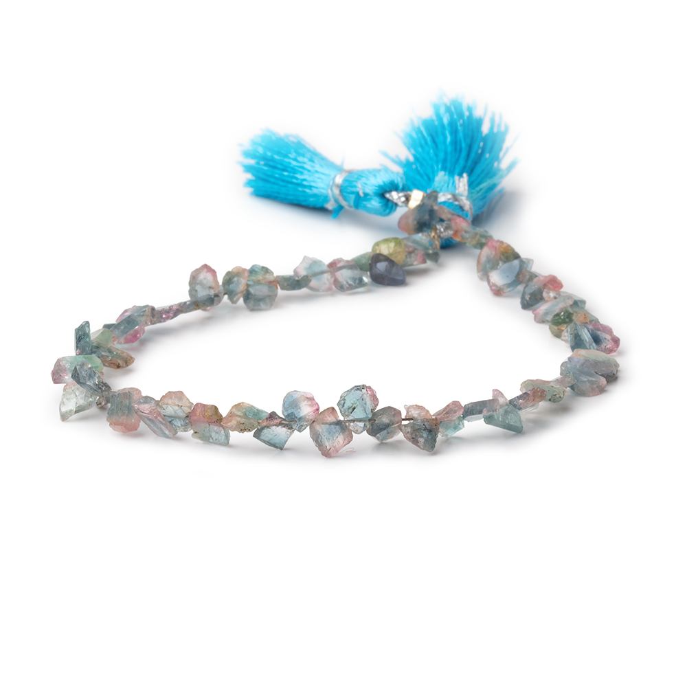 Bi-Color Indicolite Tourmaline natural crystal slices have been top drilled, measure approximately 5x4mm to 8x4mm in size, have a glass like luster with translucent bodies, the shape is organically asymmetrical and this strand is a varied saturated group of Pink and Blue Tourmaline with each bead being unique in color and shape, and the strand is consistent in quality.