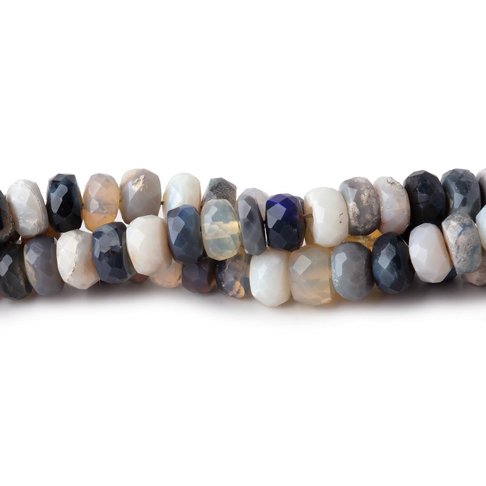 Australian Opal faceted rondelles exhibit a symmetrical shape on the strand showing opaque to translucent areas of well made blue-grey opals appearing with fabulous lavender, blue, and green Play of Color. AA Grade