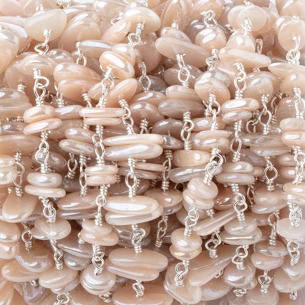 5x2mm average Mystic Pale Peach Moonstone Plain Nugget Beaded Clusters on Silver Plated Hand Crafted Rosary Chain is sold by the foot with approximately 58 beads per 12 inches. Our line of Gemstone Chain has been painstakingly hand-wrapped between each bead to create consistent measure. Our chains are sturdy enough to hold pendants or to use for layering within an ensemble.