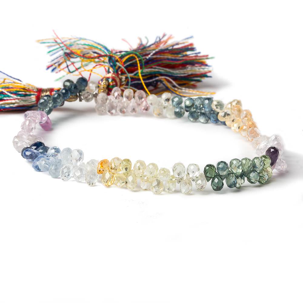 Micro Faceted Rainbow Sapphire tear drop beads exhibit vitreous luster and strong brilliance in the petite 5x3mm average size beads showing a transparent quality on the AAA grade strand.