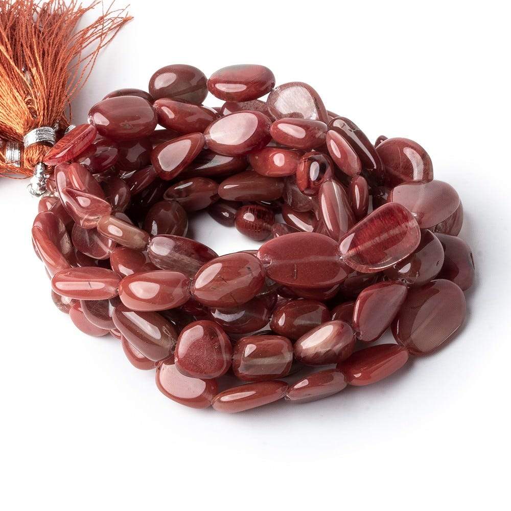 Andesine Plain Nugget Bead exhibit a vitreous luster, a nicely made asymmetrical flat shape of a deeply saturated strongly reddish brown hue, translucent bodies show faint schiller and color zoning throughout the mottled strand.
