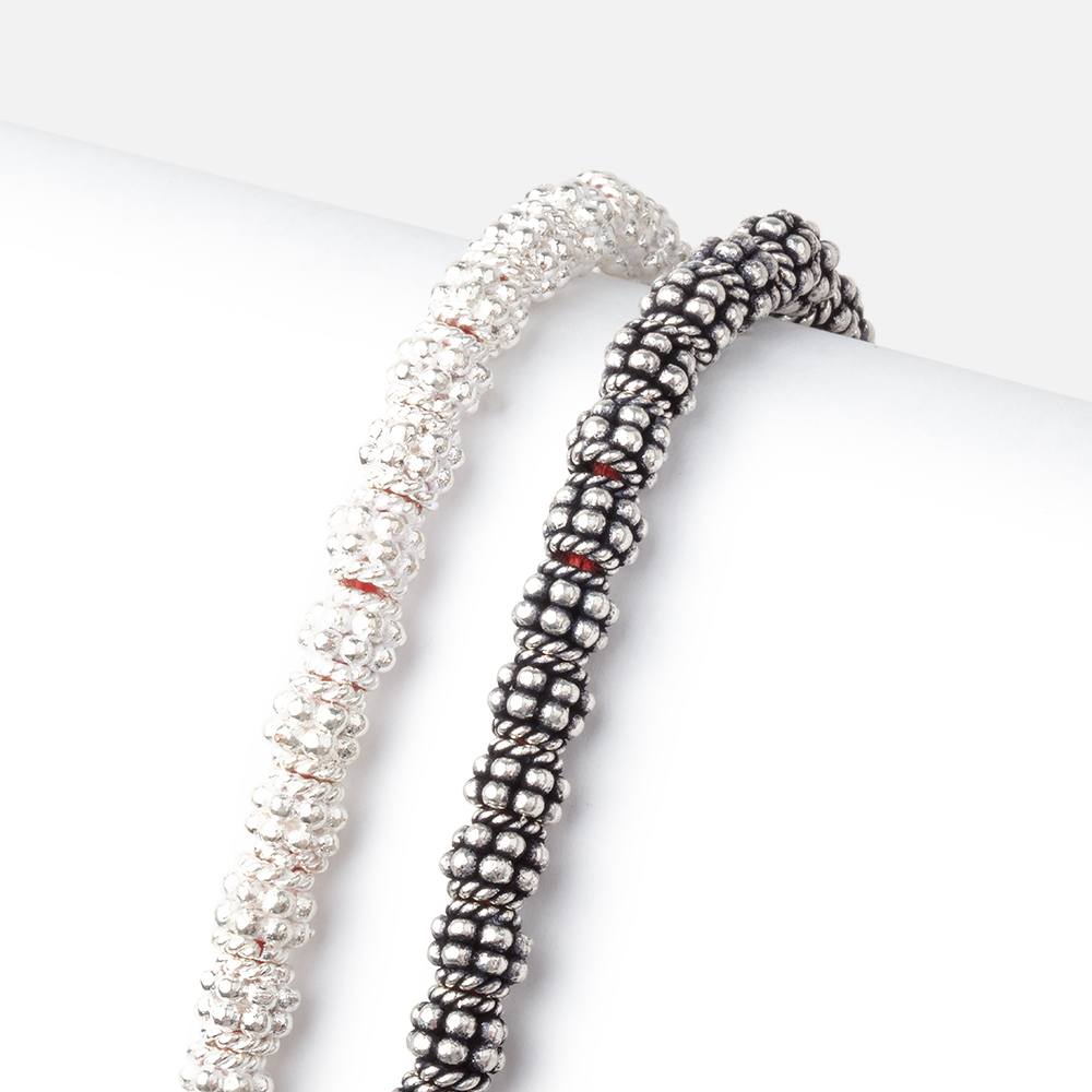 5x4.5mm Double Daisy Spacers stacked with twisted rings have a 1mm drill hole and are plated over copper. This 8 inch strand with approximately 43 beads is available in Silver and Antiqued Silver.