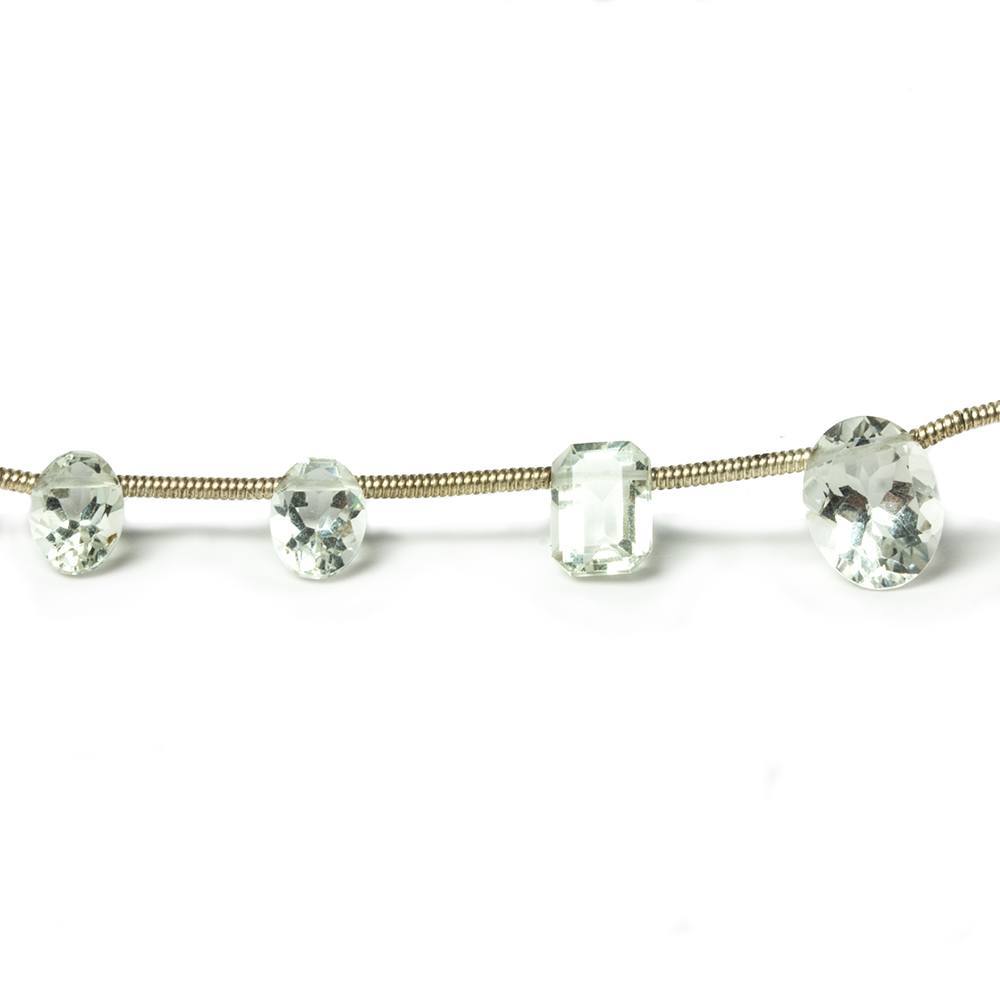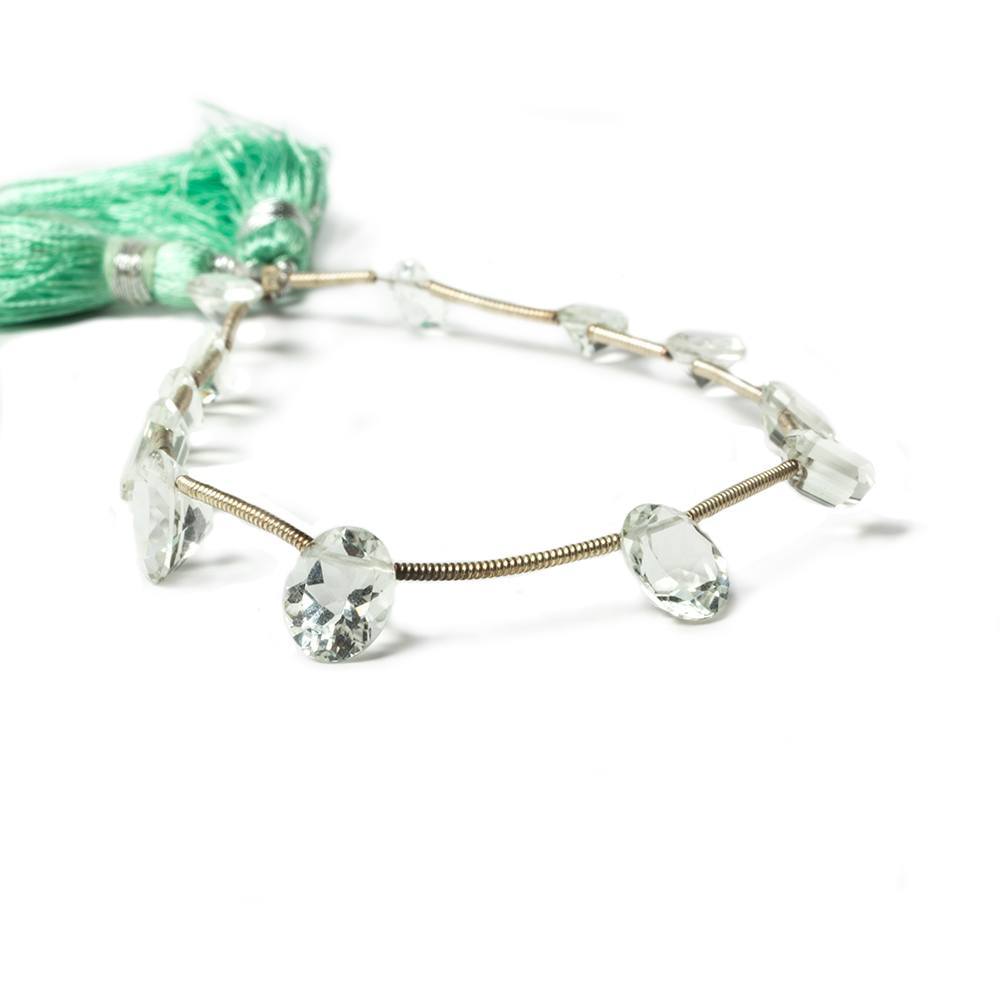 Prasiolite Pavilion Faceted Assorted Shapes measure approximately 5x4mm to 9x7x5mm in size, these beads show a vitreous luster with excellent polish and faceting, exhibit calibrated symmetrical shapes that are top drilled, gems are a transparent quality showing minor internal characteristics, these Prasiolite beads have pavilion faceting creating a strong brilliance, and the Green Amethyst beads (Prasiolite) bodies are a medium mint green hue in round brilliant, oval and emerald cuts.