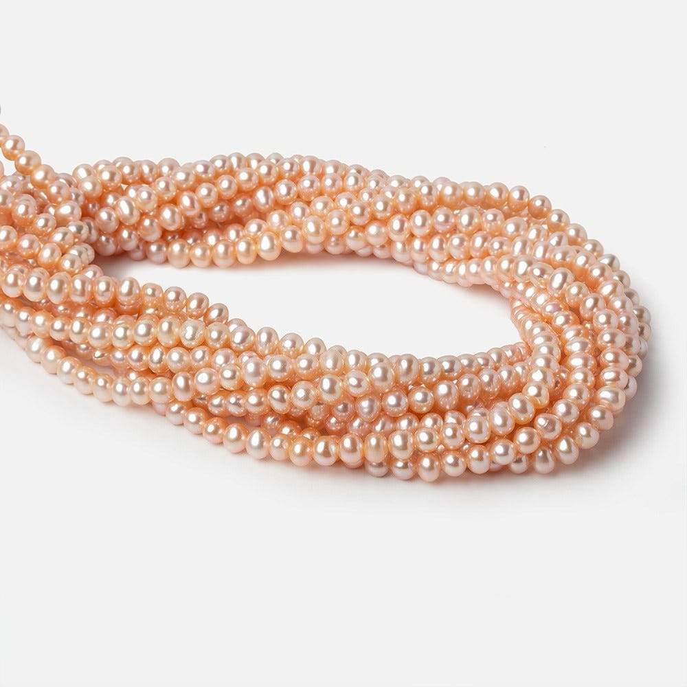 5x4mm Blush Peach Side Drilled Off Round Freshwater Pearls show excellent luster, excellent nacre quality, well matched on strand, uniform size with symmetrical shape, and is a color treated freshwater pearl. 96 pieces