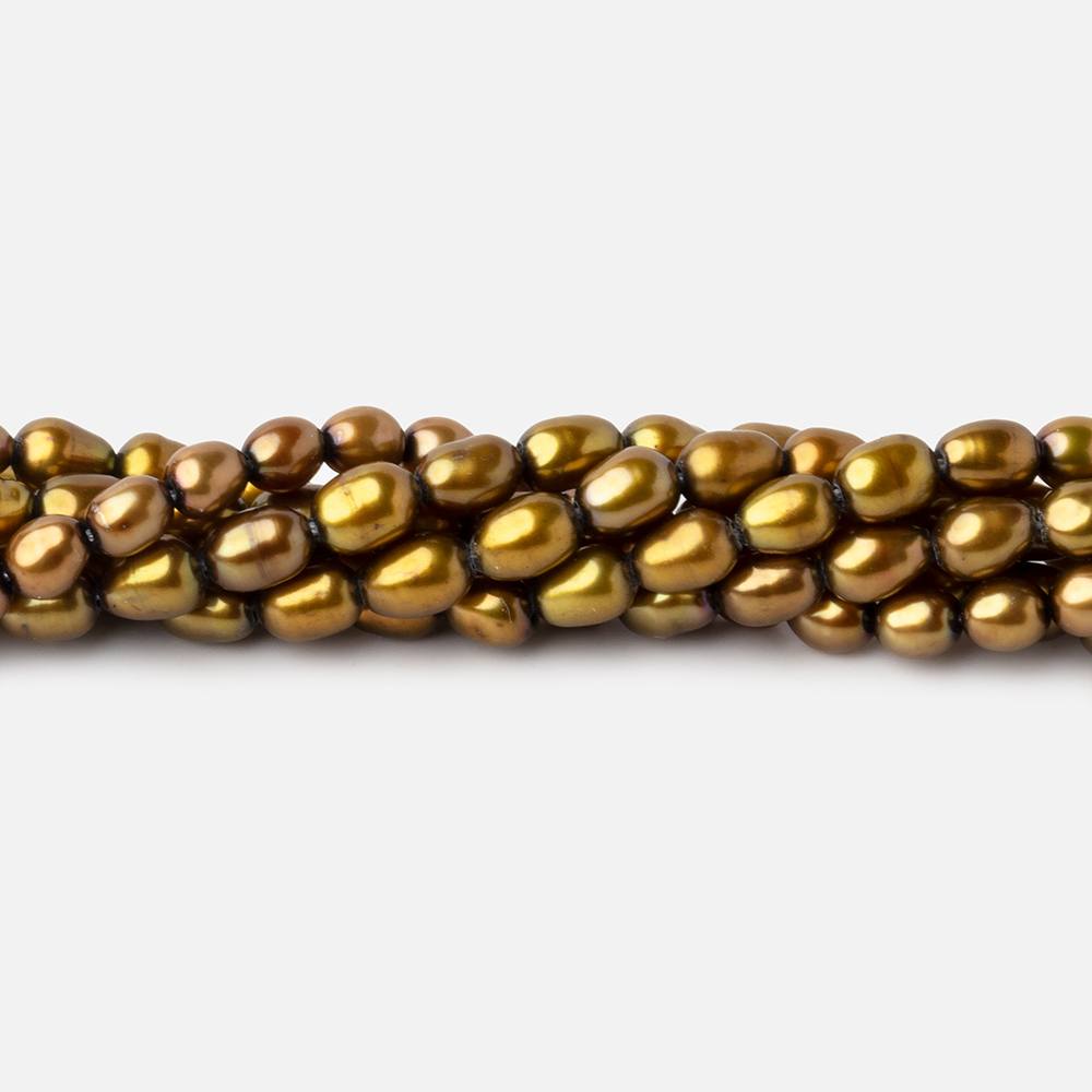 Lemongrass Green Straight Drilled Oval Freshwater Pearls measure approximately 5x4mm average in size, have an excellent high luster, excellent nacre quality, well matched on strand, have an average size, and the color is a green hue with a strong yellowish overtone
