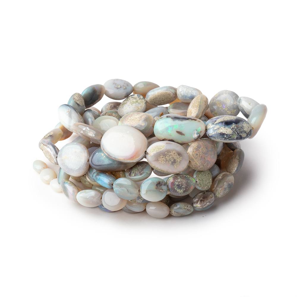 Australian Opal Nugget Beads have an asymmetrical shape showing opaque to translucent areas with vibrant Play of Color and an organic appearance due to areas of matrix which add soft creamy beige hues. A spectacular grouping having a polished body with areas of pitting due to surface irregularities of the natural opal. AA Quality