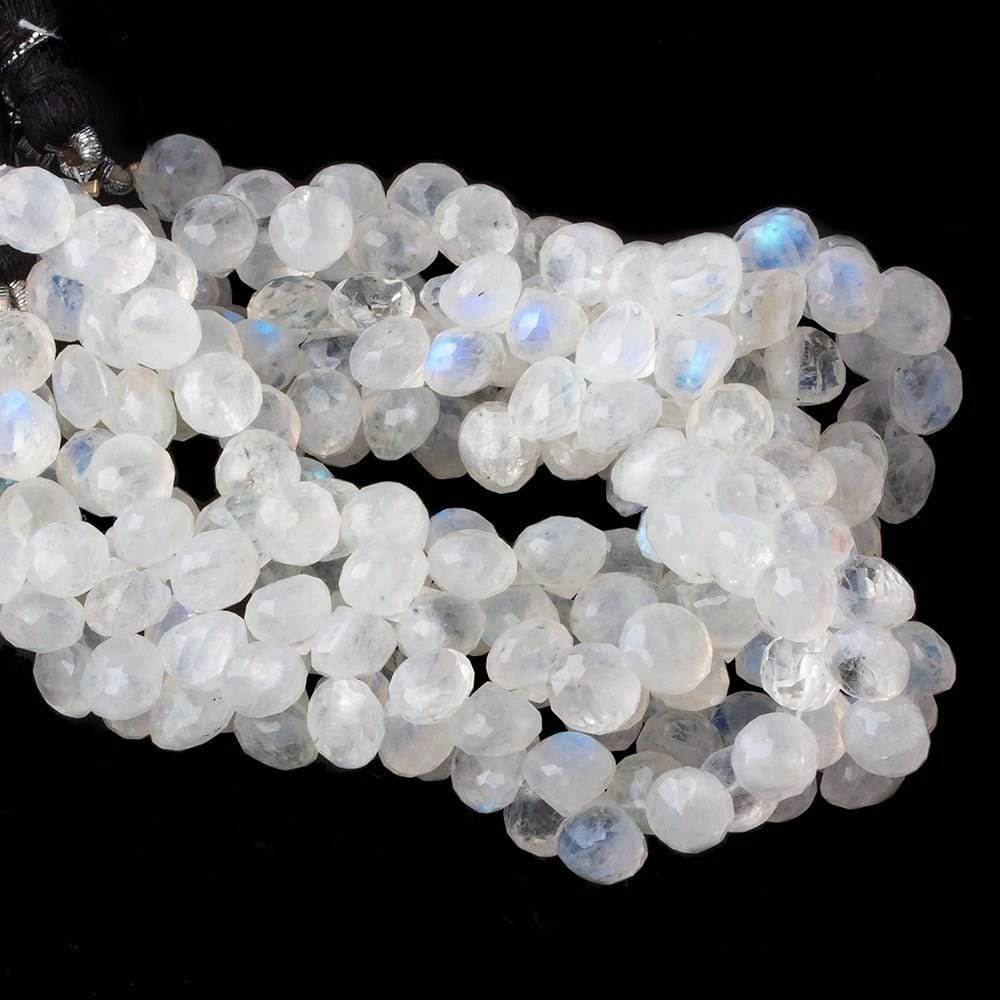 Rainbow Moonstone faceted candy kiss Briolettes show a glass-like luster, good polish and faceting, fairly symmetrical shape, excellent brilliance with an etherial glow, bodycolor is a colorless hue with multi color labradorescense, and the body is a cloudy translucent quality providing a lovely faceted onion bead or candy kiss bead strand grading a A Quality.