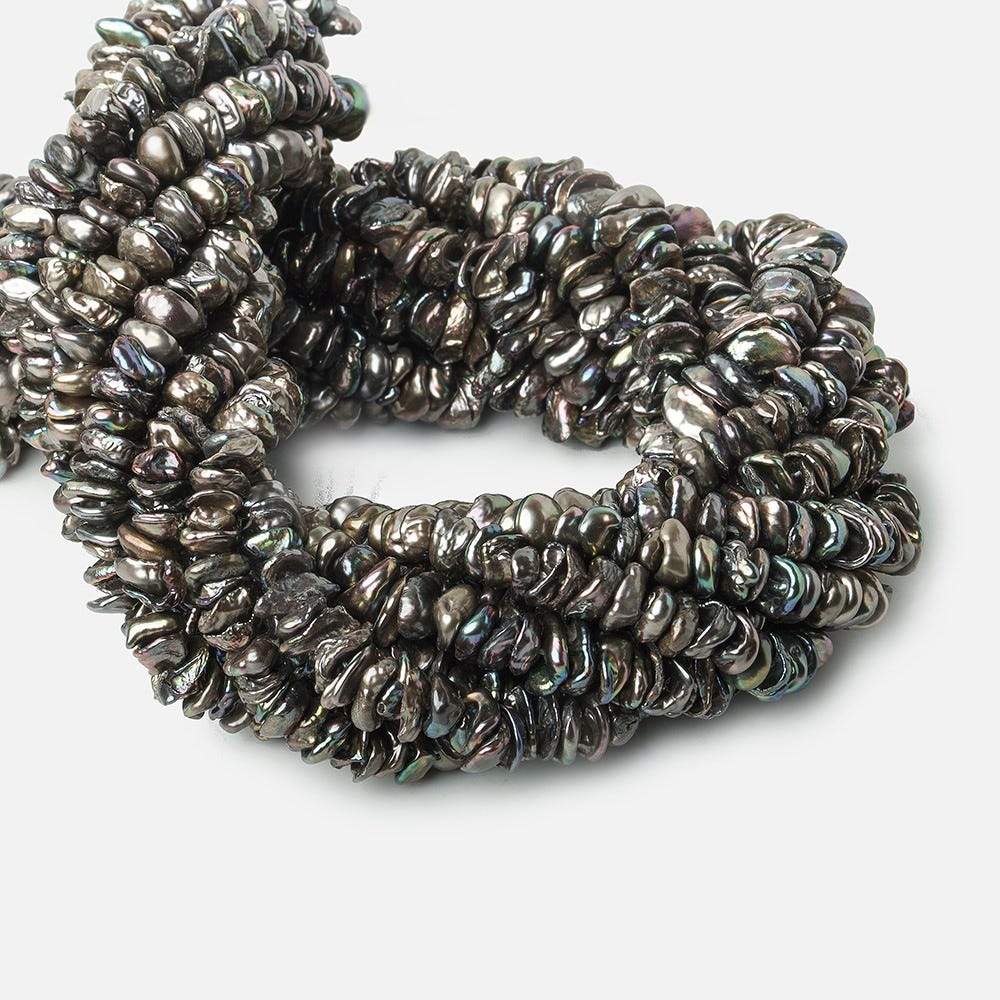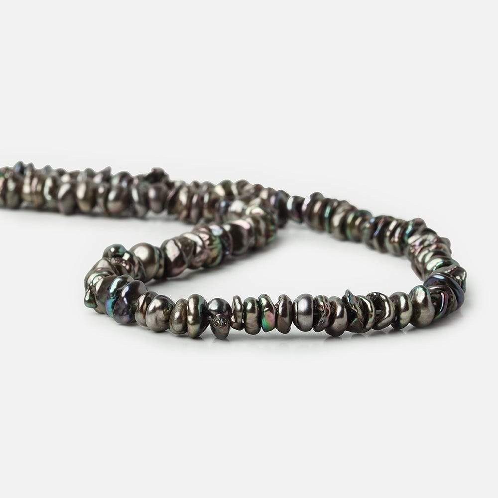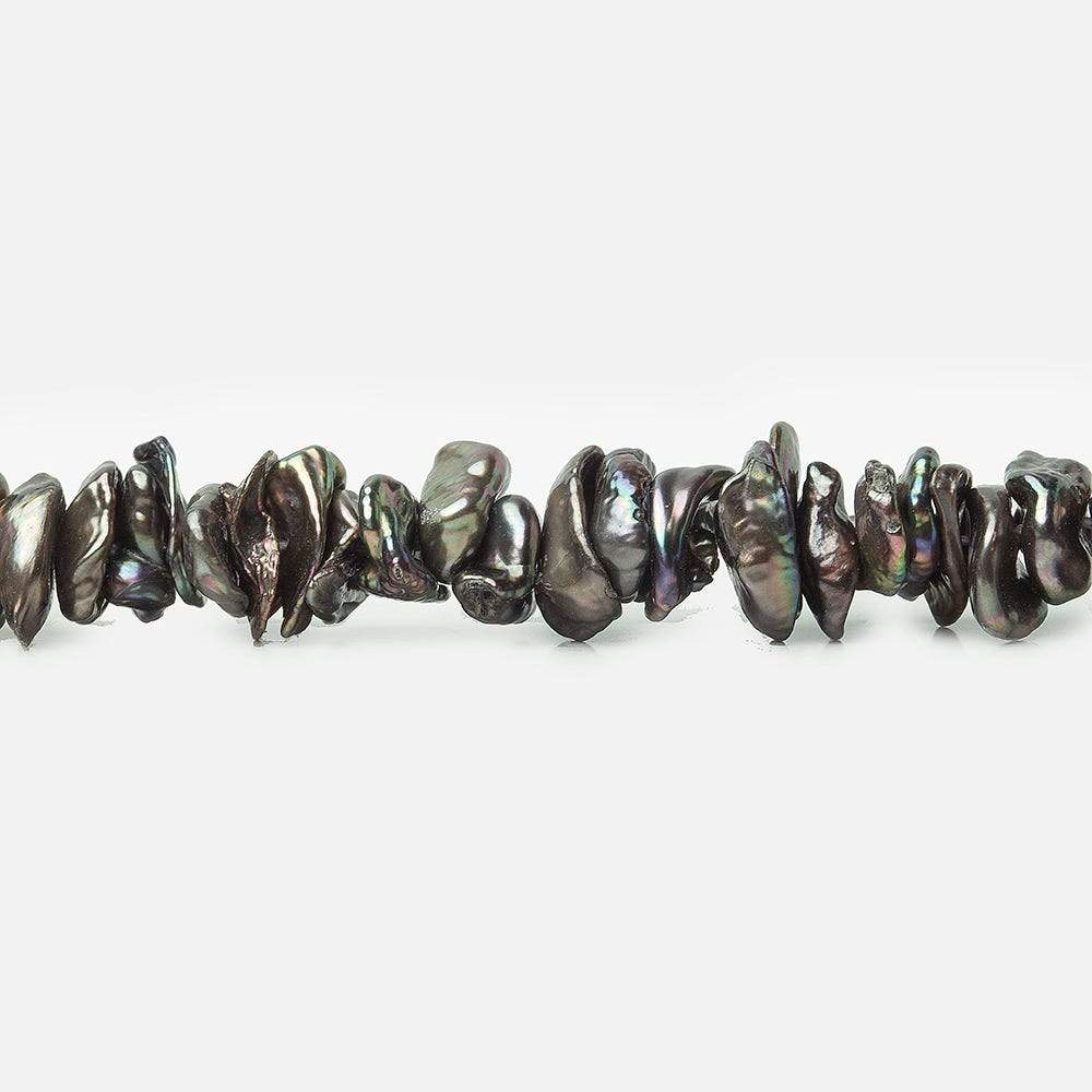 Peacock Keshi Freshwater Pearls have been center drilled for varied usage with an approximate average 4mm width. These freshwater pearls have a cornflake-like Keshi shape measuring approximately 6x5mm to 20x5mm in diameter. These multi-color iridescent orient peacock pearls are well matched on the strand for treated color, quality, luster, and shape.